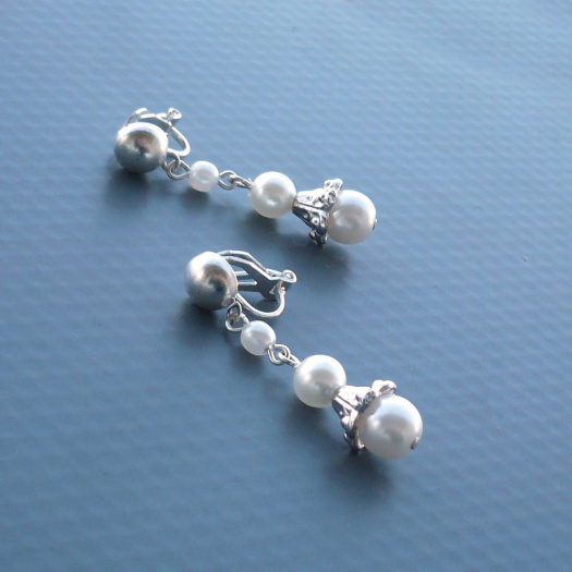 Náušnice jsou z ozdobného bižuterního komponentu stříbrné barvy a bílých voskovaných skleněných perliček.
