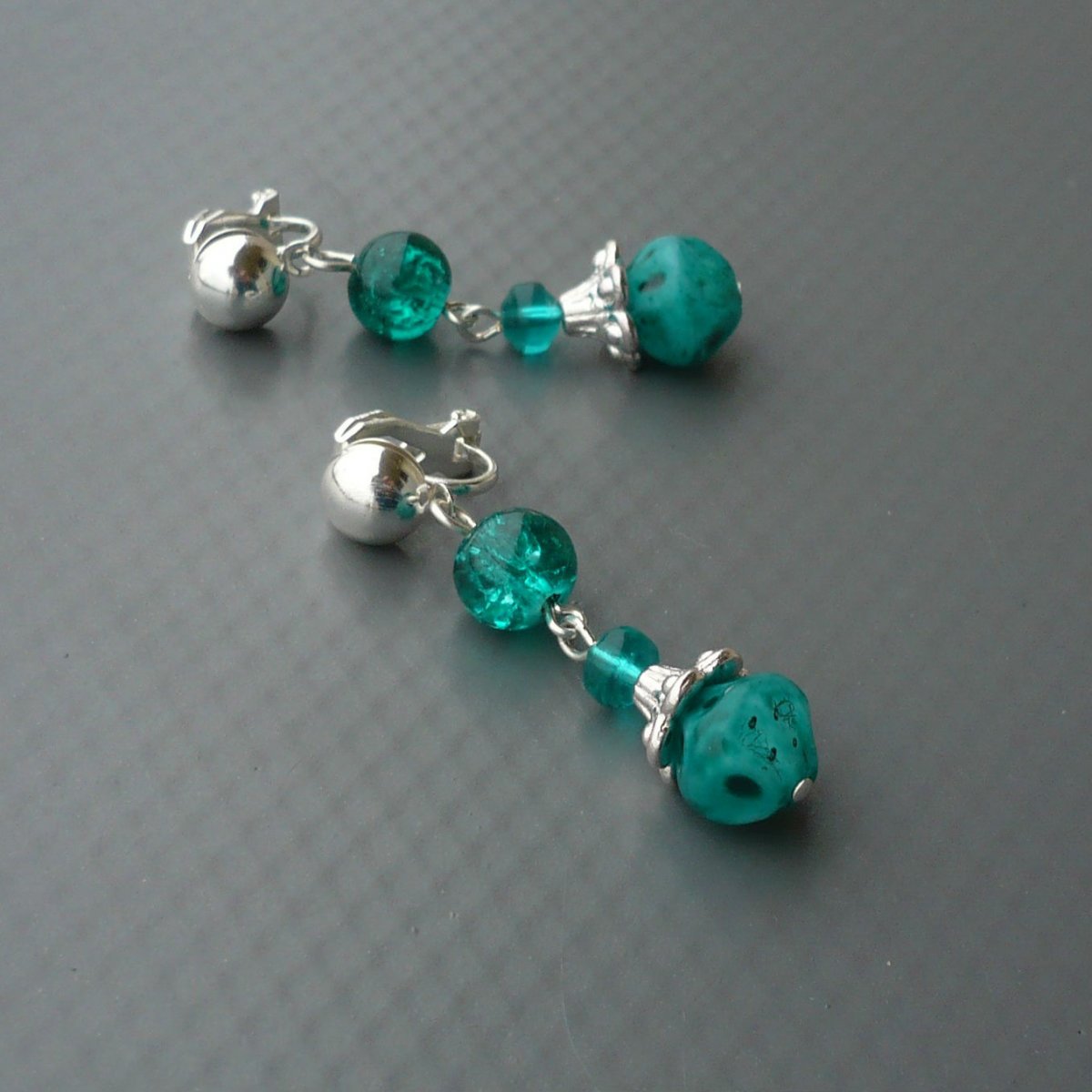 Náušnice jsou z smaragdově zelených skleněných korálků, ozdobného bižuterního komponentu stříbrné barvy a spodního velkého smaragdově zeleného mourovaného tvarovaného skleněného korálku.