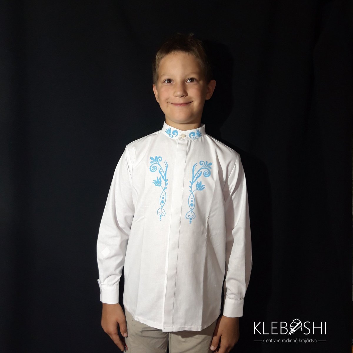 Voľnosť, pohodlnosť a eleganciu im košeľa poskytuje svojím 100% bavlneným materiálom, ležérnym strihom a golierom – stojačikom s ručne maľovaným ornamentom, ktorý tvorí optickú ilúziu viazanky