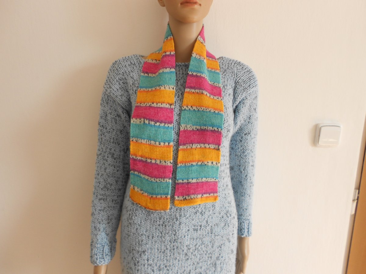 Dětská pletená šála. Velikost: délka 106 cm, šířka 10 cm. Doporučuji jemné praní a sušit volně položené.