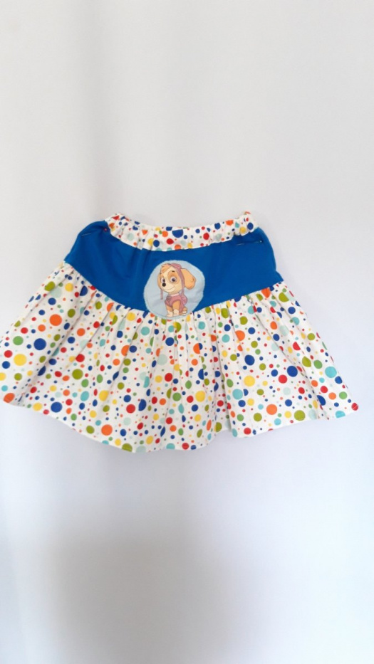 Bavlnená detská suknička pre najmenšie parádnice so sedielkom. V páse na gumu. Kombinácia modrého bavlneného úpletu a jemného bavlneného plátna s obrázkom obľúbenej postavičky z rozprávky Labková patrola.