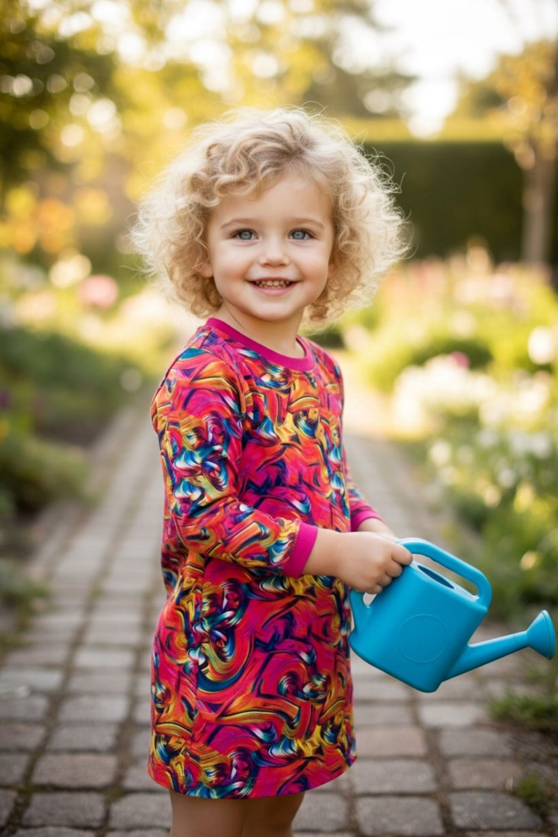 Barevné dětské šaty z pružné bavlněné teplákoviny – pohodlný model s dlouhým rukávem, praktickými kapsami a výrazným abstraktním vzorem, který si děti zamilují.