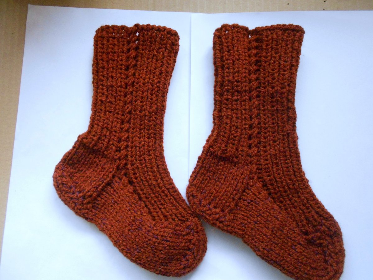 Teplé, ručně pletené, bezešvé ponožky s vlnou, rezavé. Pletené pružným vzorem - patentem. Velikost: 30-31. Doporučuji praní na 30 st.C.