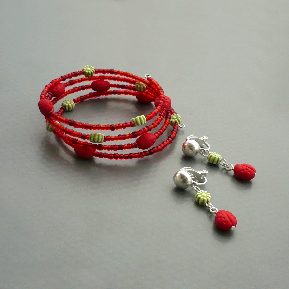 Červené korálkové berušky a světle zelené květinky jsou navlečeny na čtyřech řadách paměťového drátku (i přes velké roztažení se vrátí do svého původního tvaru).