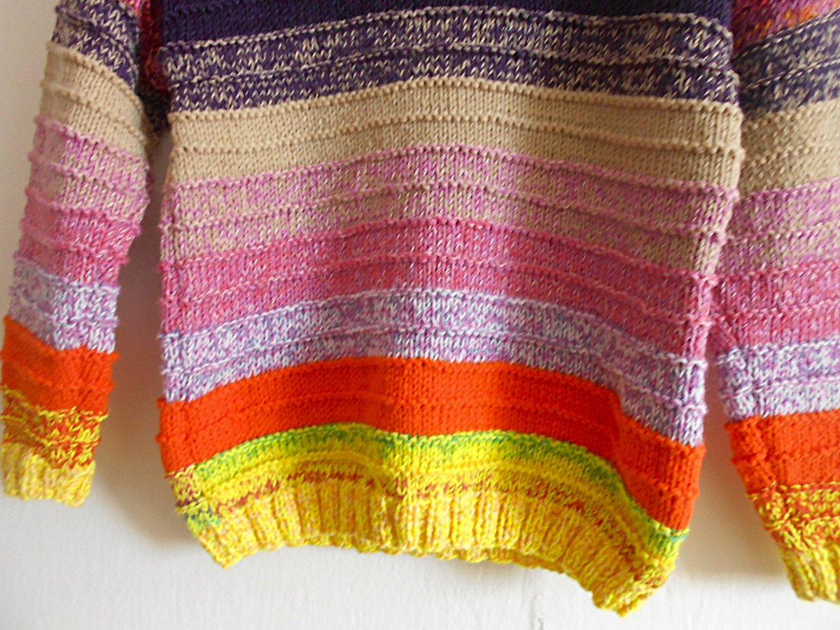 Dětský ručně pletený rolák s merinem, velikosti 128-134, délka 50 cm, šířka 41 cm, vnitřní délka rukávu 38 cm. Materiál: 60% merino, 20% akryl, 10% vlna, 10% bavlna. Barvy jsou výraznější než na fotografii.