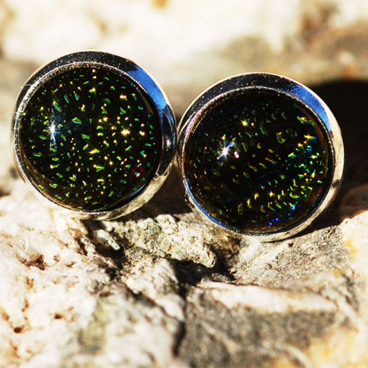 kabošony z dichroického skla 10 mm, puzety, vzadu klasický motýlek.