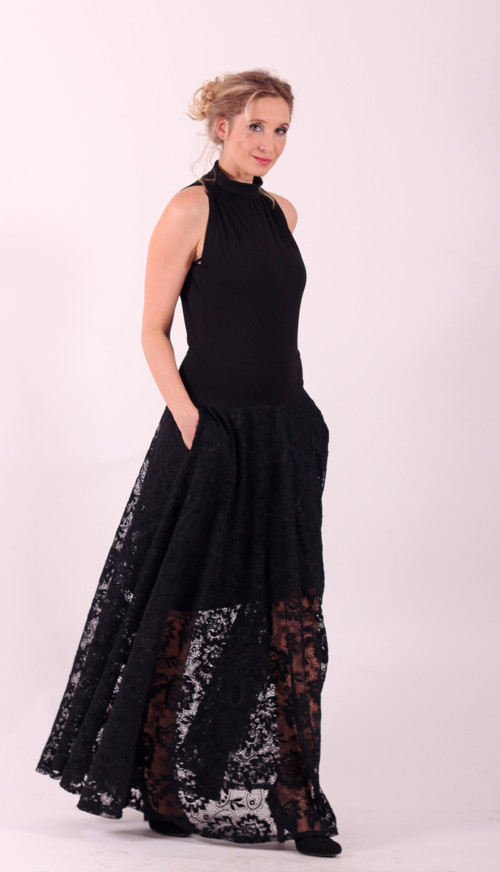 Dlouhá polokolová sukně je ušitá z pružné syntetické krajky. Má spodničku a je stařená do pružného pásku. V bočních švech jsou kapsy.
