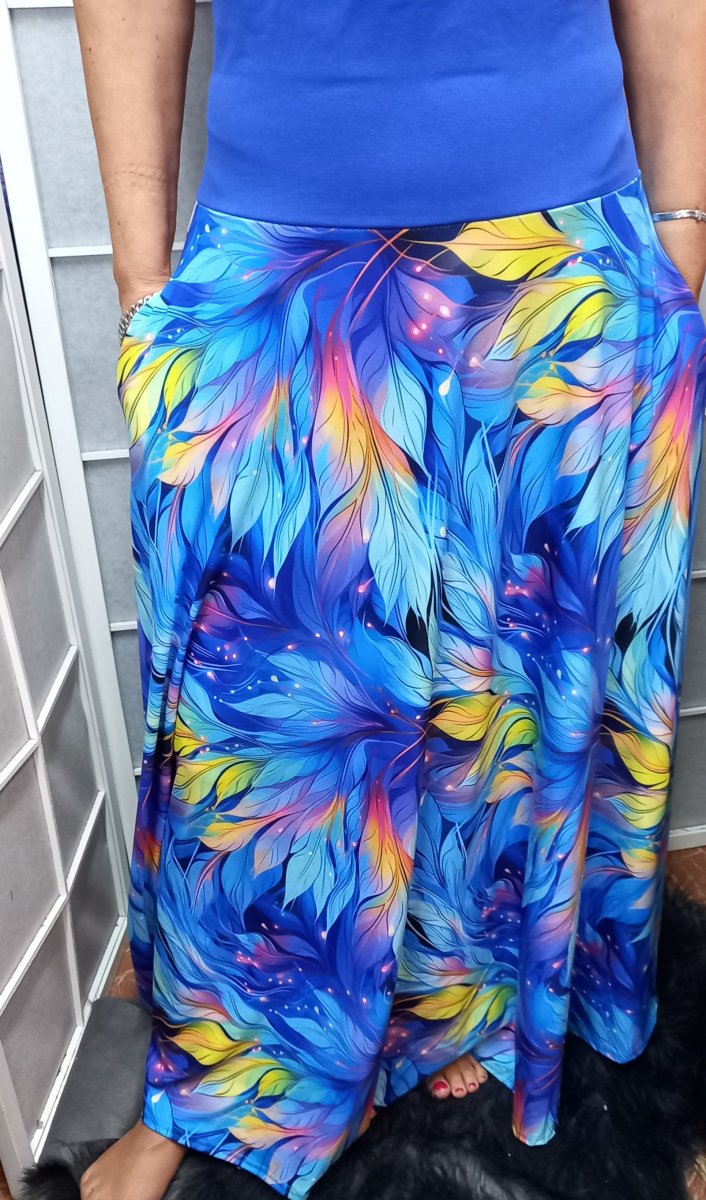 V bočních švech jsou všité kapsy. Do pásku je navlečená široká guma, kterou lze snadno upravit. Délka je ukončena coverlockem.