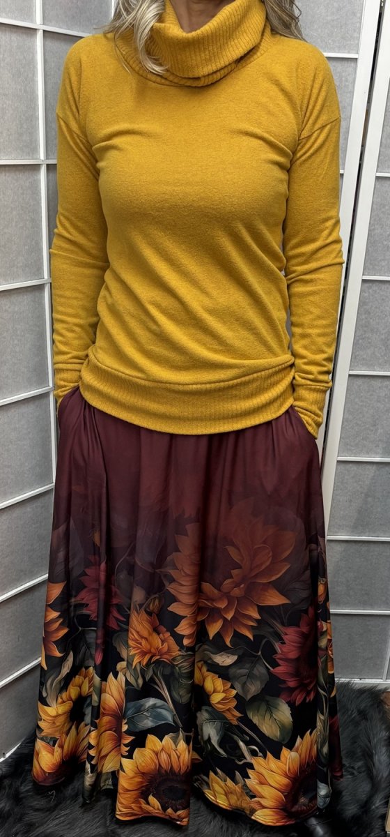 V bočních švech jsou všité kapsy. Do pásku je navlečená široká guma, kterou lze snadno upravit. Délka je ukončena coverlockem.