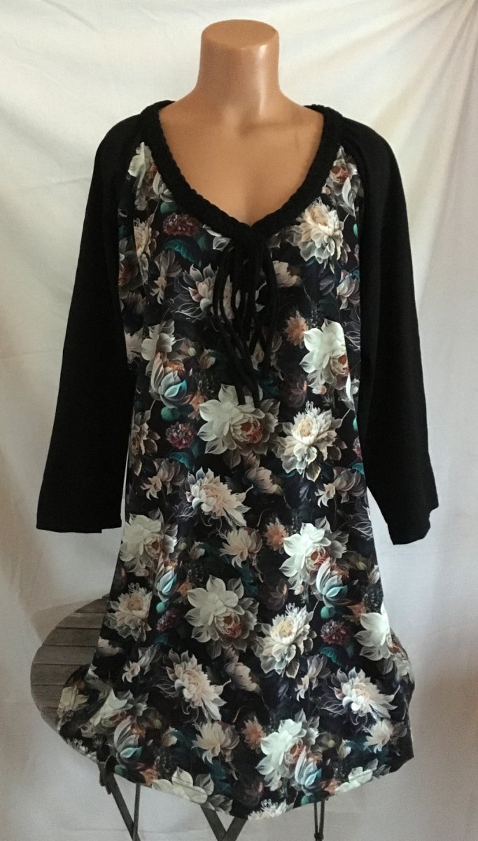Tunika s opleteným výstřihem a prostříhanými raglánovými rukávy. Mírně projmutá, vel. 4XL- přes prsa do 135 cm, boky do 145 cm, délka 98 cm, elastický bavlněný úplet.