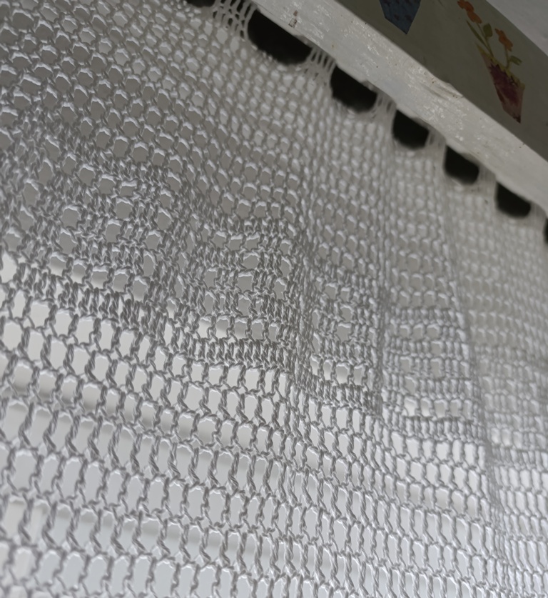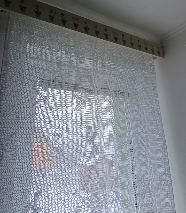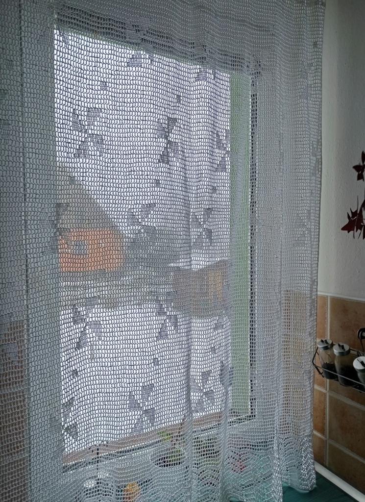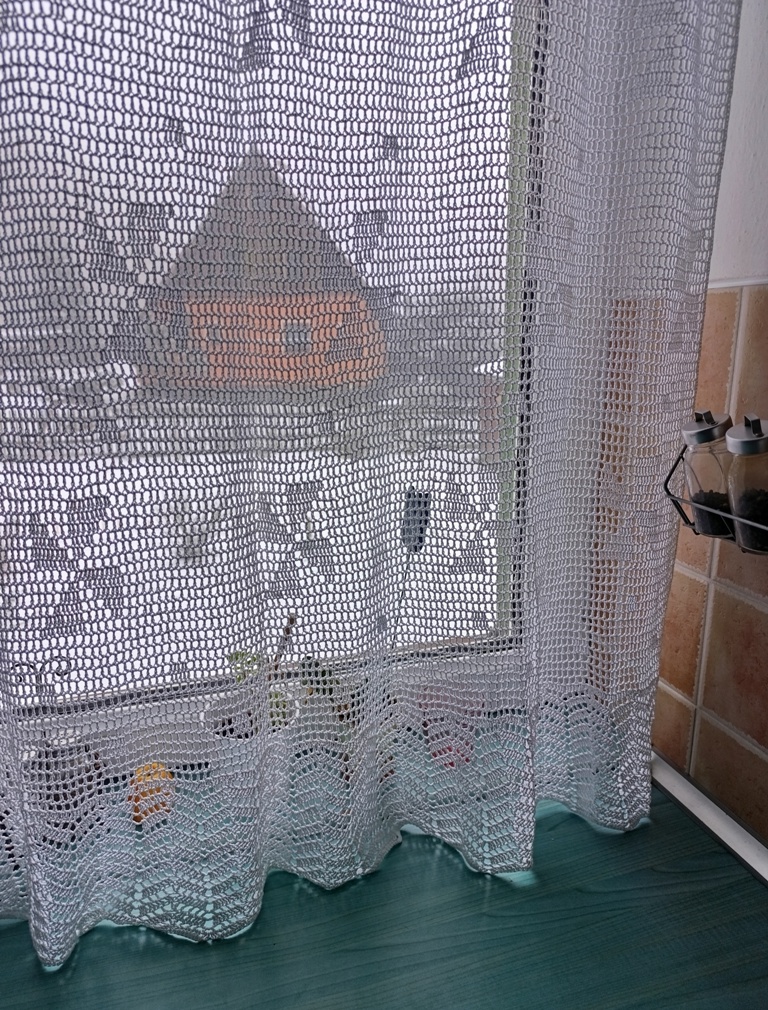 Háčkovaná záclonka z bavlněné příze. Pro pověšení můžete použít žabky nebo tyč. Záclona má v horním kraji otvory pro tyč. Na spodním okraji je bordura, která vytváří mírný kanýrek.