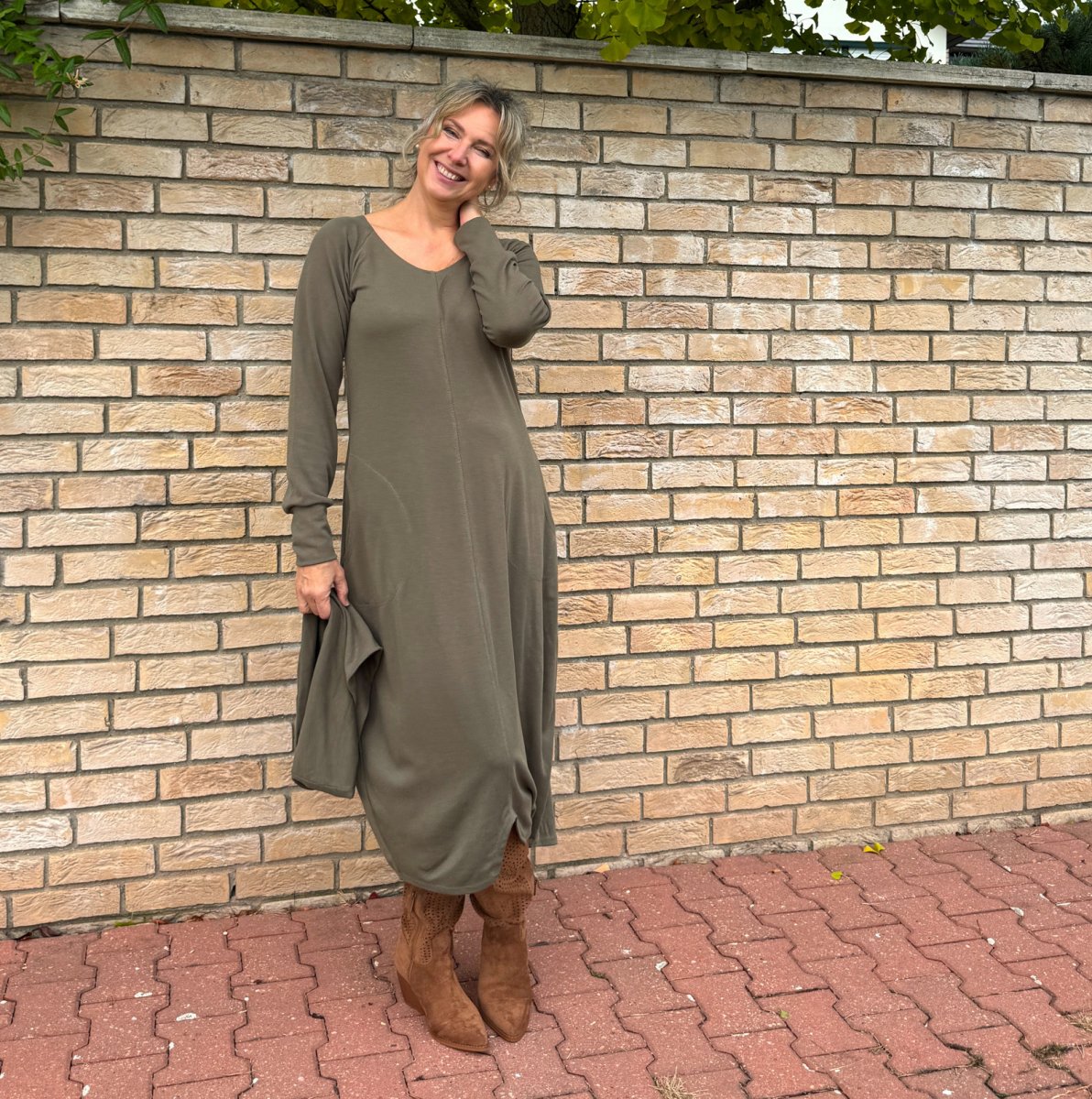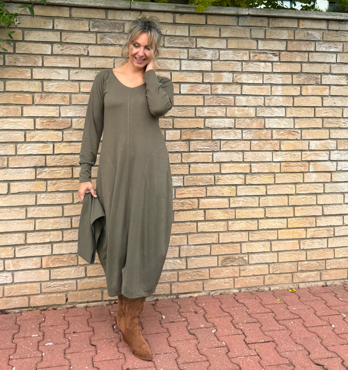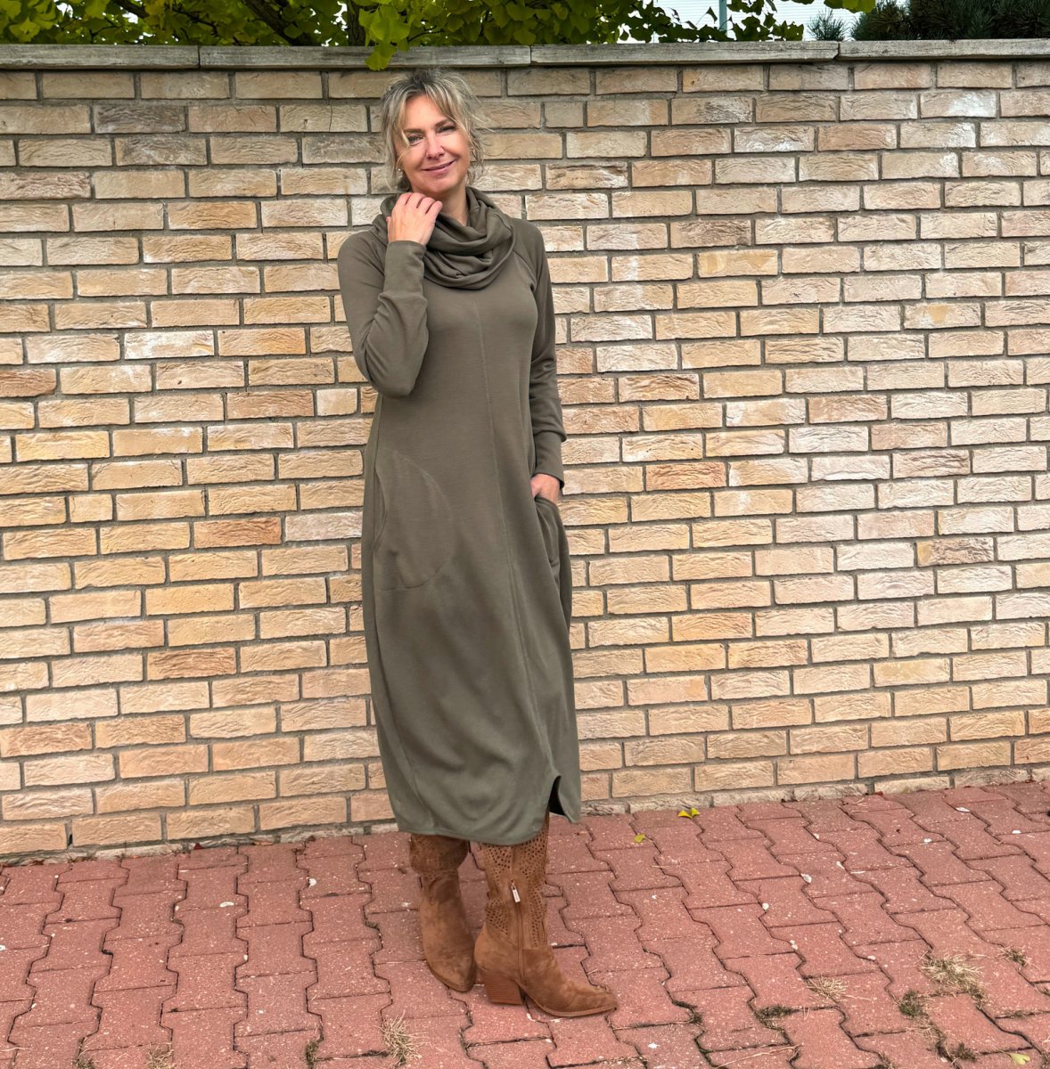 Pohodlné šaty ze středně silného úpletu (68%viskóza/28%polyester/4%elastan). balonového střihu s véčkovým výstřihem. Pro pohodlnou chůzi má sukně ve předu i vzadu výkroje do V. Na bocích jsou kapsy. Šaty mají dlouhý rukáv a součástí je stejnobarevný nákrčník.