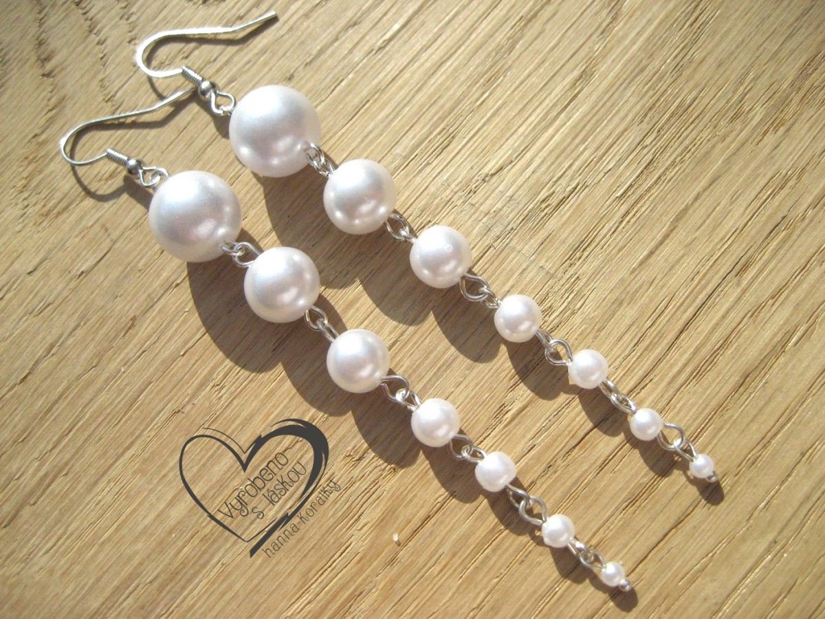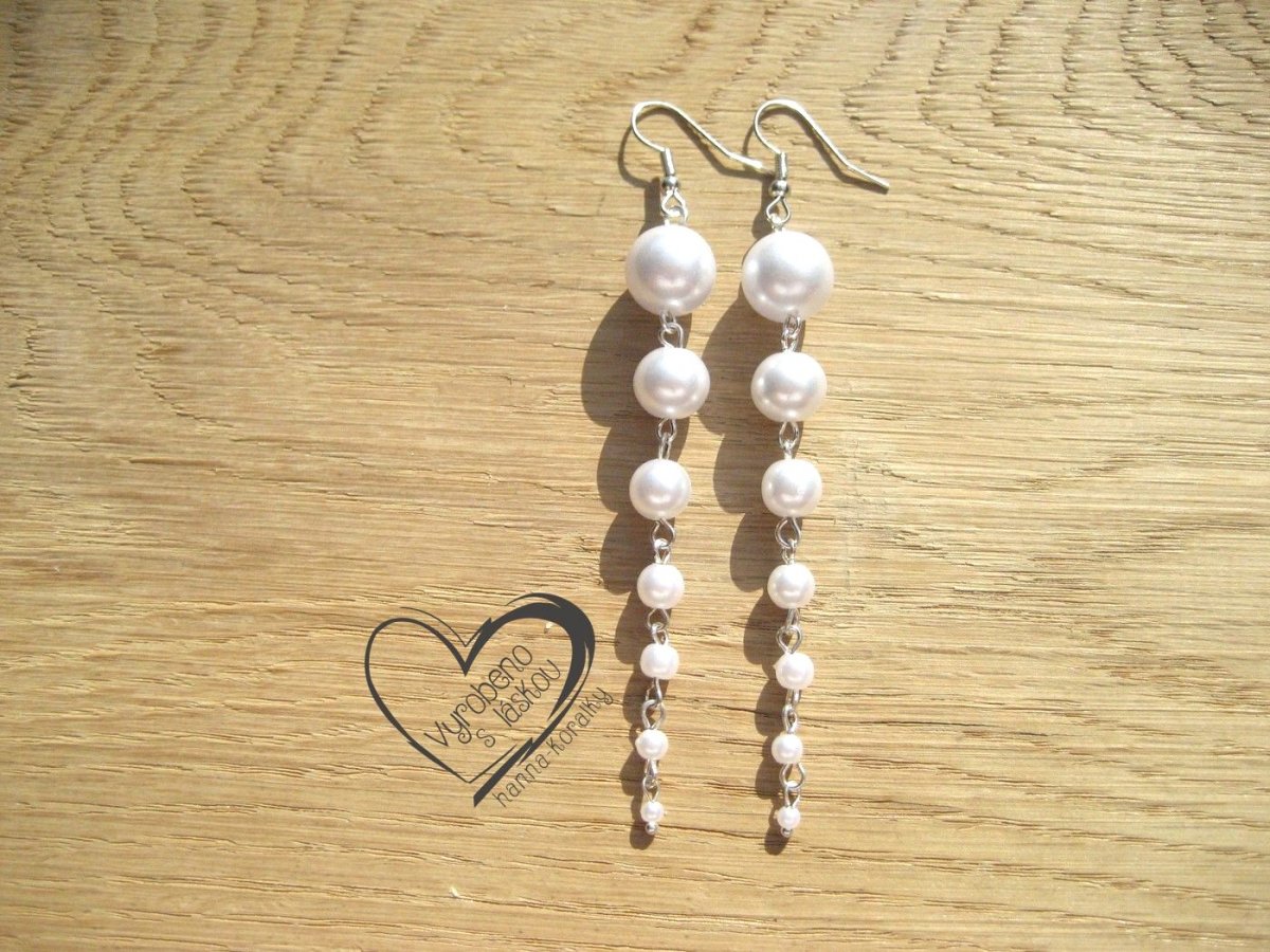 Dlouhé bílé elegantní a lehké náušnice ze 7 různých velikostí akrylových perel - korálků - od největší po nejmenší a bižuterního kovu, délka náušnic 8cm + náušnicový háček