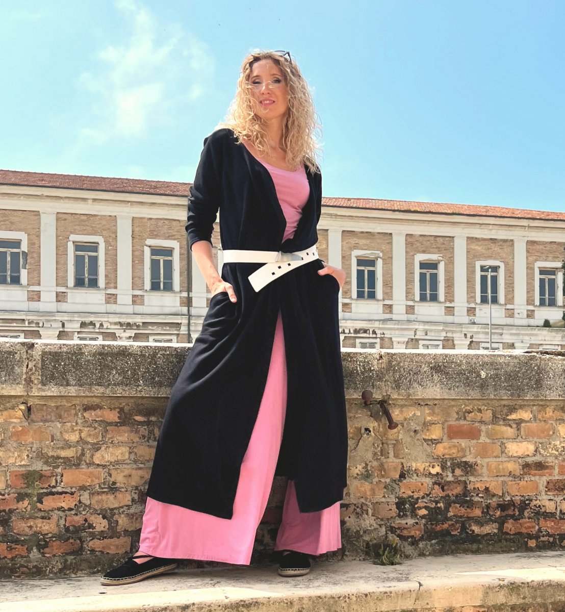 Volný kardigan je ušitý z úpletu viskóza/elastan . Může se nosit volně nebo přepásaný páskem. V bocích jsou kapsy. Rukáv ve 3/4 délce.