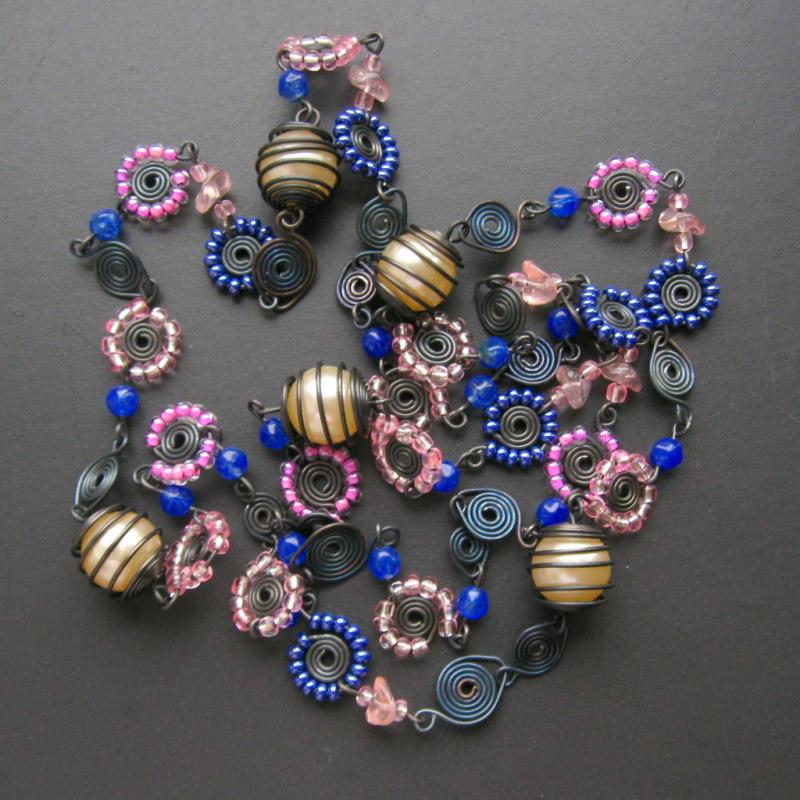 Drátovaný náhrdelník z černého 1 mm hrubého drátu s modrými a růžovými drátovanými kytičkami cca 1,5 cm velkými, s plastovými perlami v ručně točených klecích a s mačkanými a rokailovými korálky. Možno i v jiných barvách. Délka cca 116 cm, bez zapínací karabinky, tuto možno na vaše přání dodat. Set je vyroben pouze z drátu a korálků, bez použití jakýchkoliv sériově vyráběných komponentů. Na vyžádání možno doplnit bižuterní karabinkou. Údržba a skladování: - uchovávejte šperk na suchém, temném místě - nekoupejte se s ním, ani jej nevystavujte přílišné vlhkosti Kovové části mohou časem oxidovat.