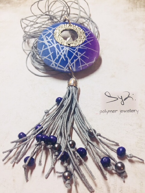 Náhrdelník o průměru cca 6 cm v modro fialové barvě je vytvořen technikou sítotisku a je doplněn kovovým komponentem a střapcem s korálky.