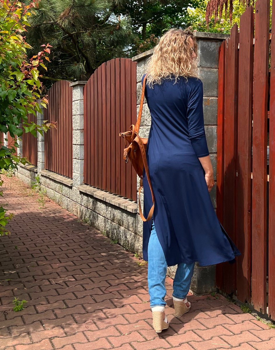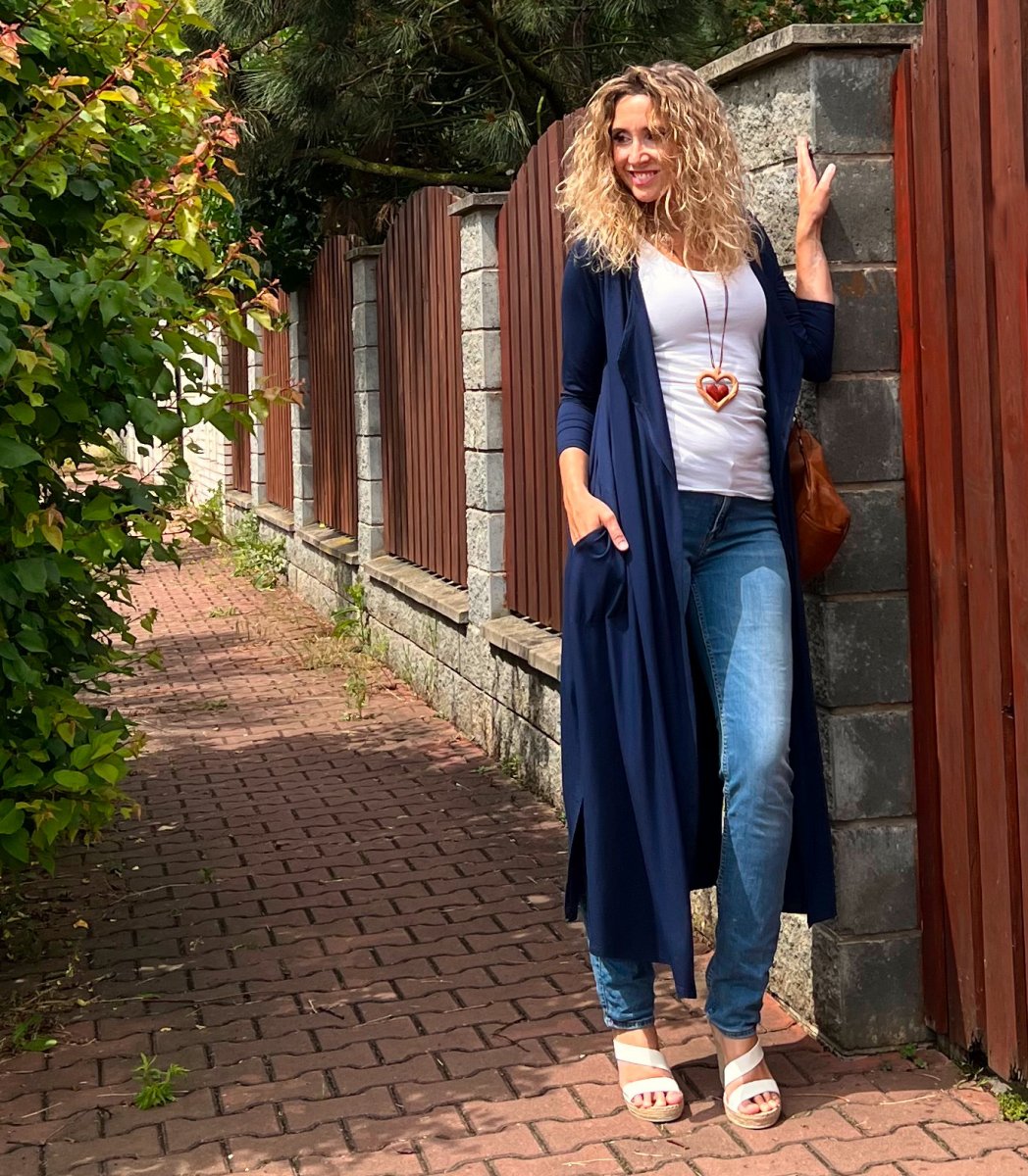 Volný kardigan je ušitý z úpletu viskóza/elastan . Může se nosit volně nebo přepásaný páskem. V bocích jsou kapsy. Rukáv ve 3/4 délce.