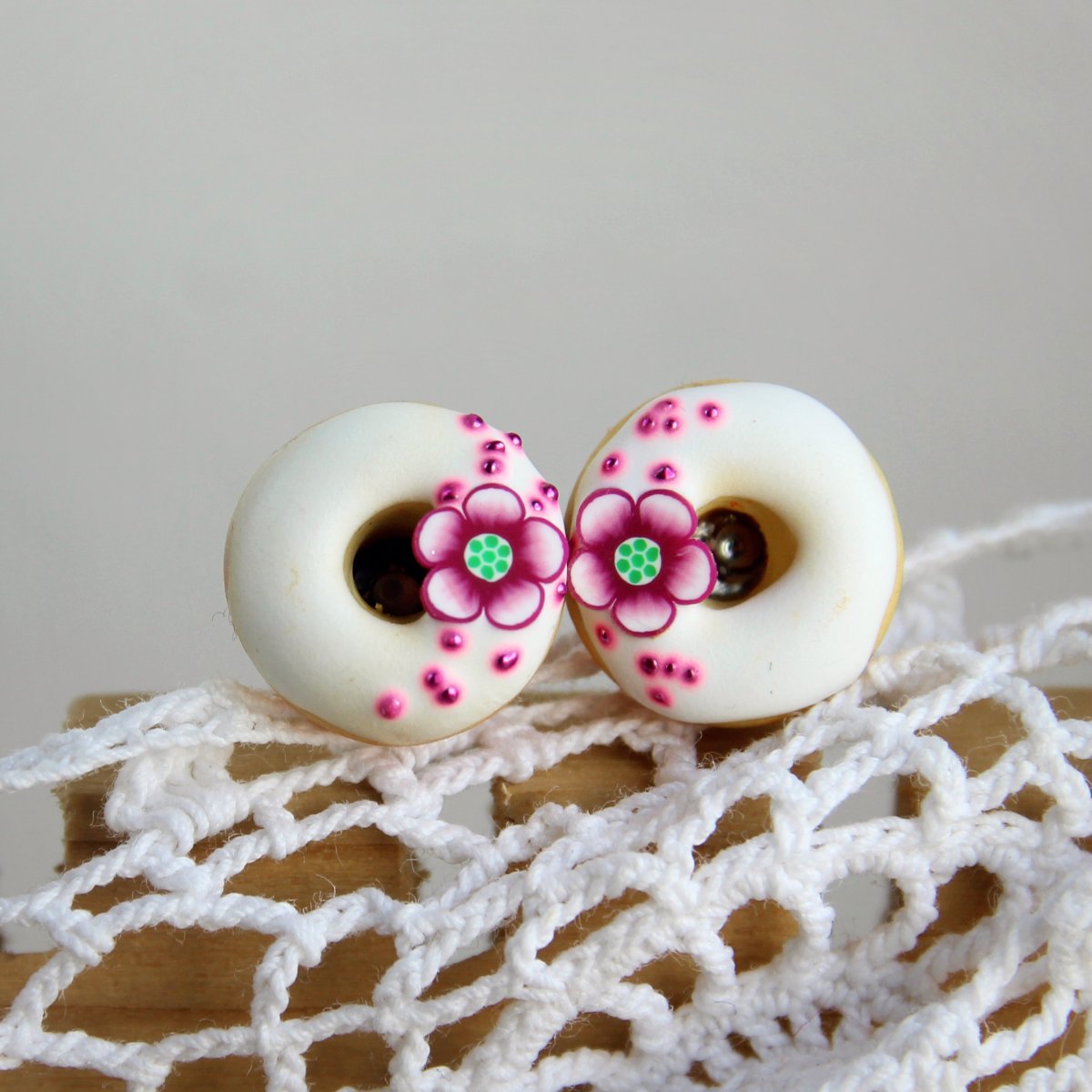 Náušnice s donuty z polymerové hmoty, průměr cca 1,2cm, gumové zarážky.