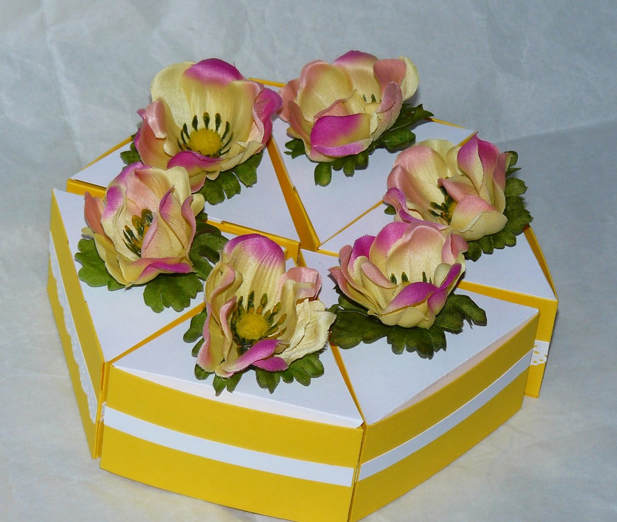 Elegantní veselé dárkové krabičky po složení vytváří dort. Vhodně na drobné dárky. Zdobeno umělou anemonkou barva žluto růžová