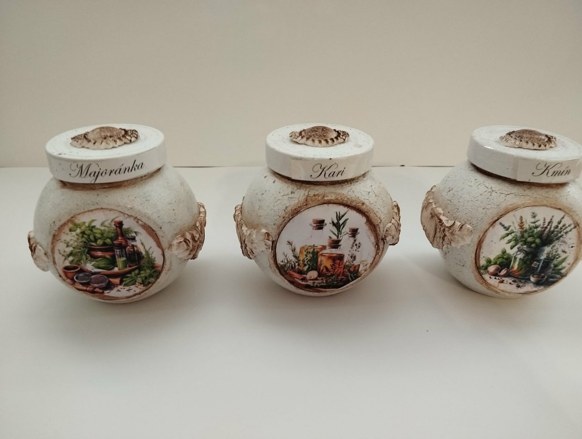 Skleněná doza ma výšku 8 cm x 8 cm . Skleničky jsou zdobeny kuchynským motivem z obou stran a dozdobena filigrány . Z jedné strany názvy koření , které jdou pěkně obměnit
