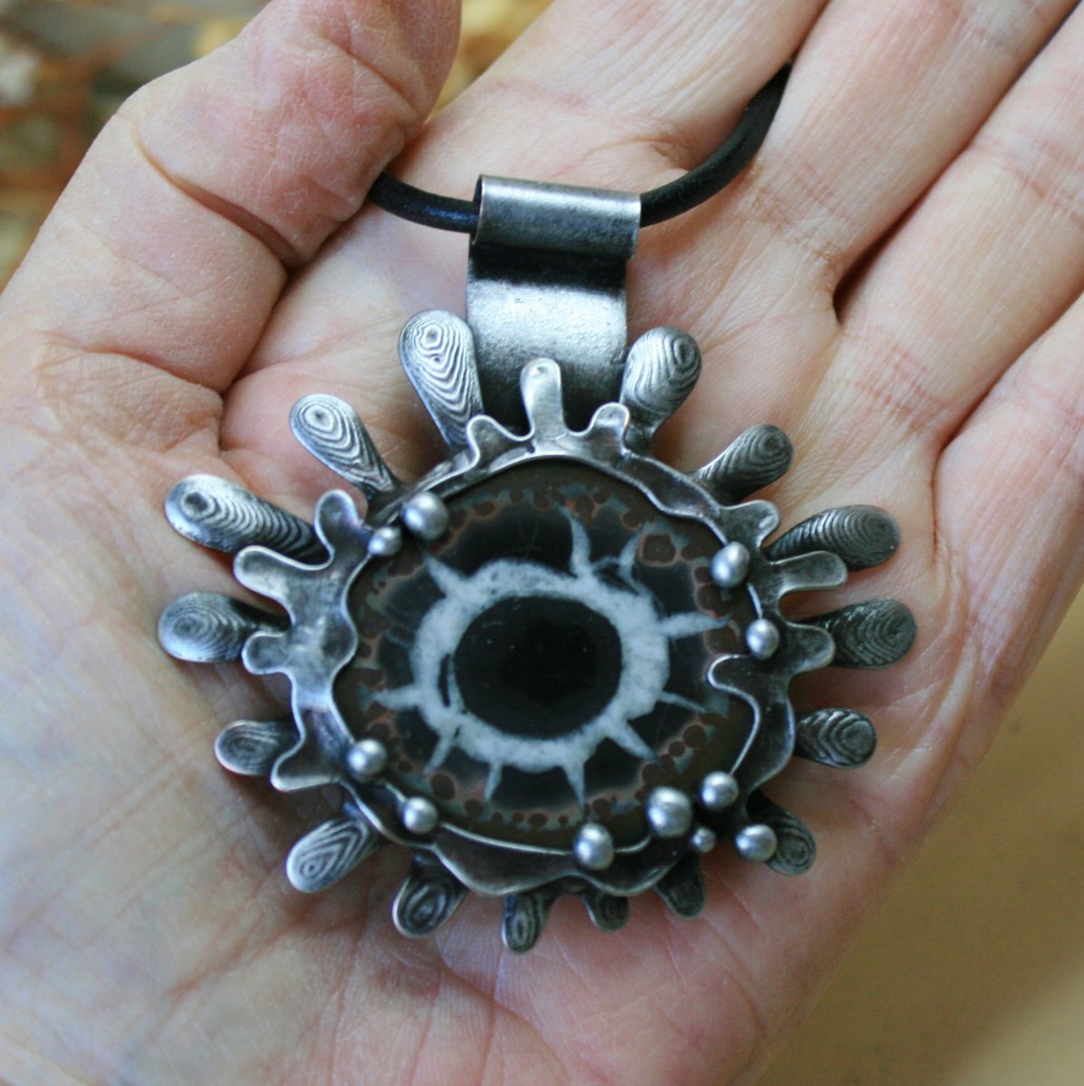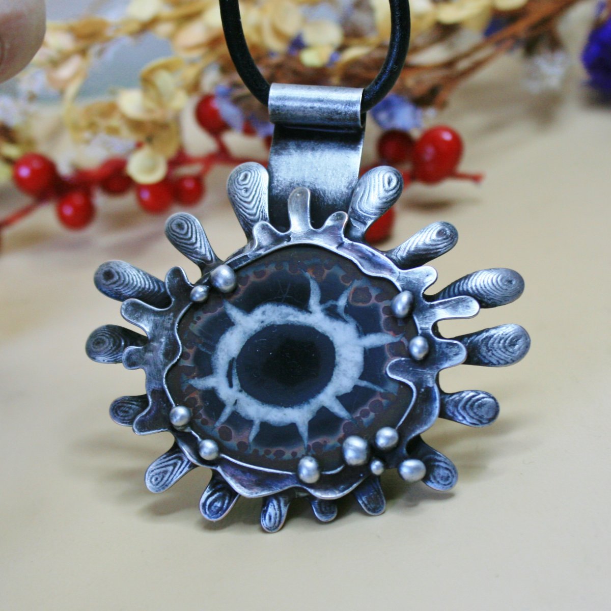 Cínovaný náhrdelník je vytvořen z krásně zbarvené velké septárie. Septárie měří v průměru 4 cm.