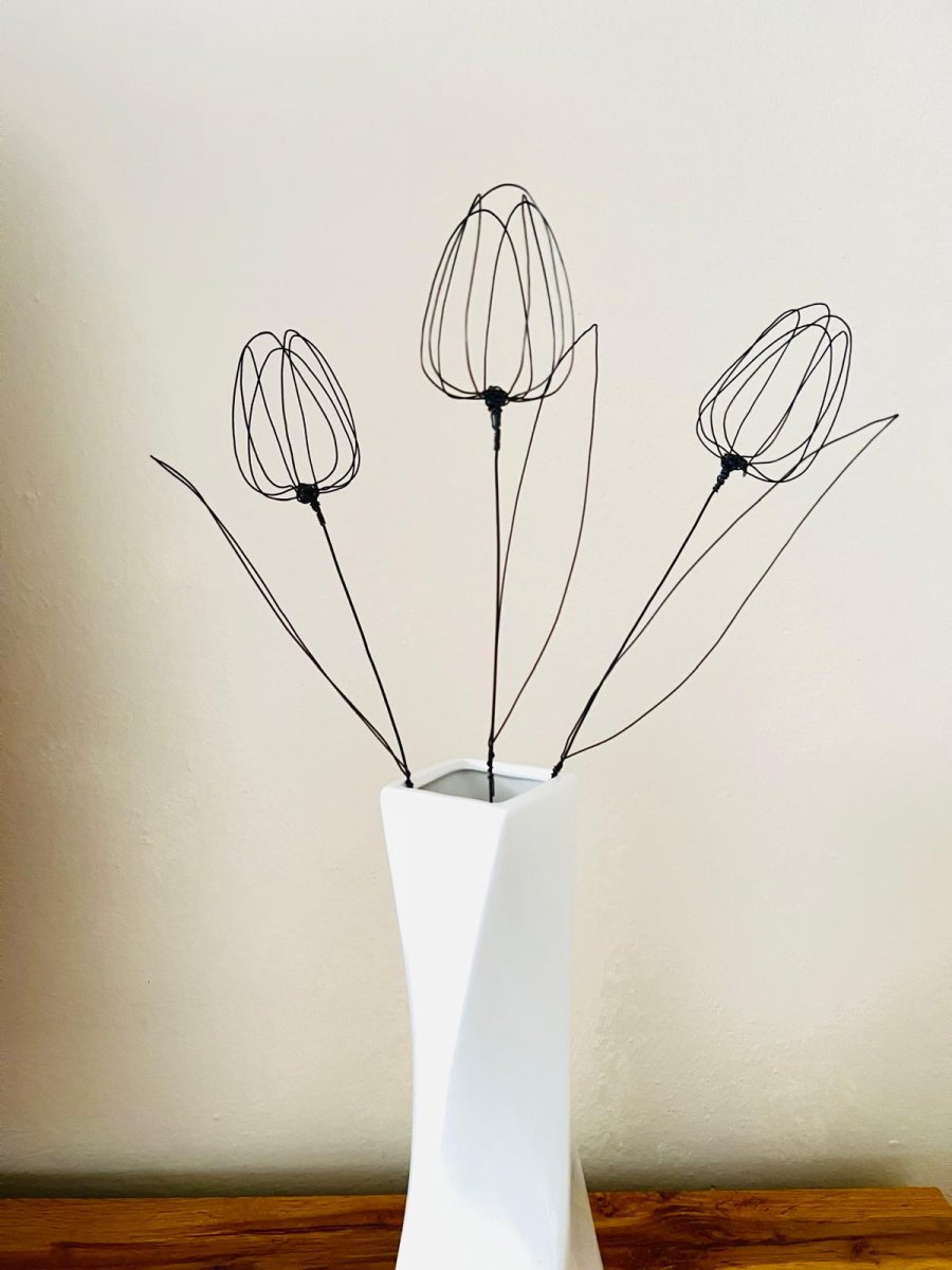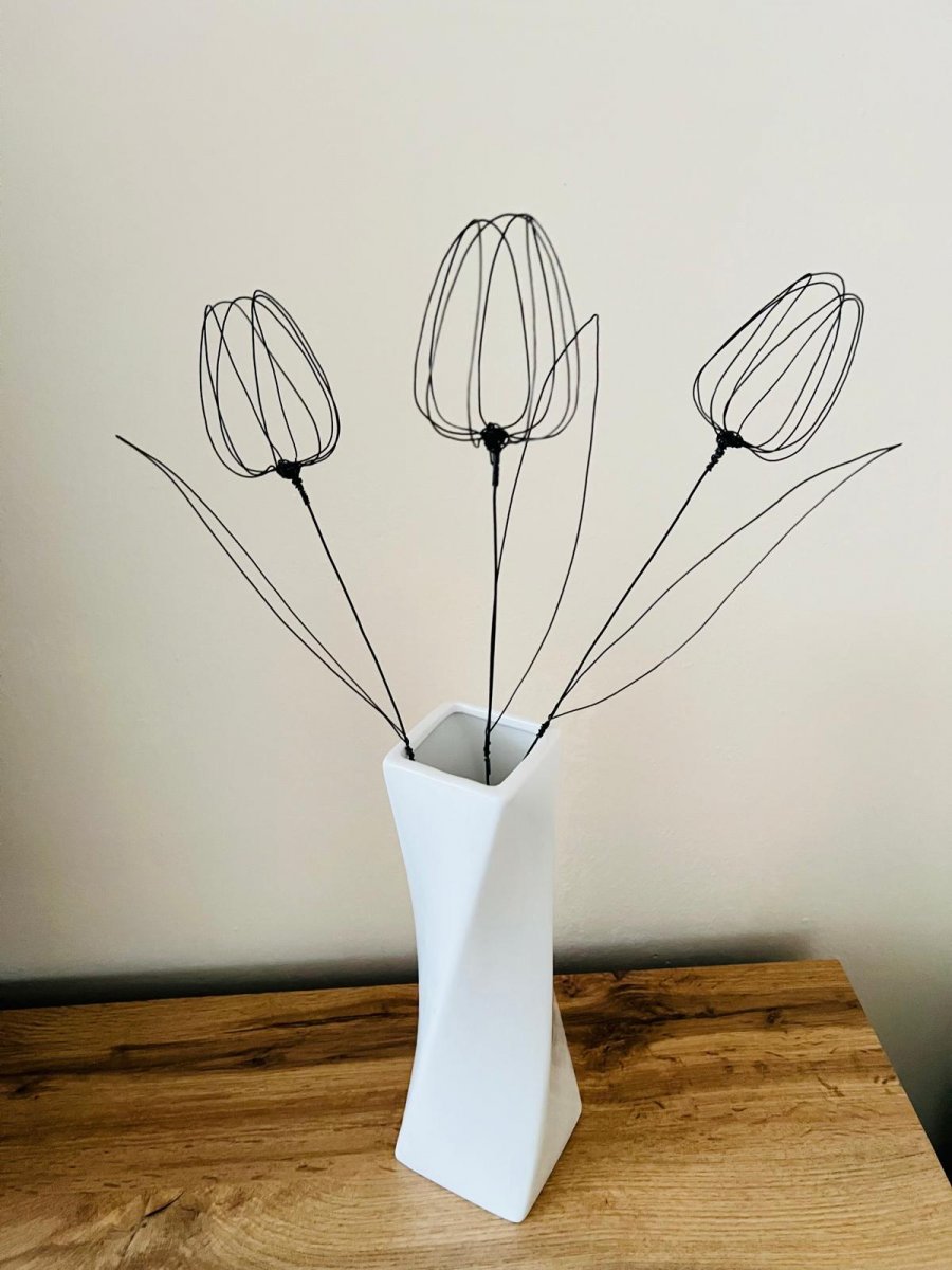 Ručně vyrobené Tulipány z černého (žíhaného) drátku. Vhodné jako dekorace do vázy nebo jako nevšední dárek k narozeninám. Výška cca 40 cm. Výška květu 8 cm, průměr květu 6 cm. Ošetřeno lakem proti korozi.