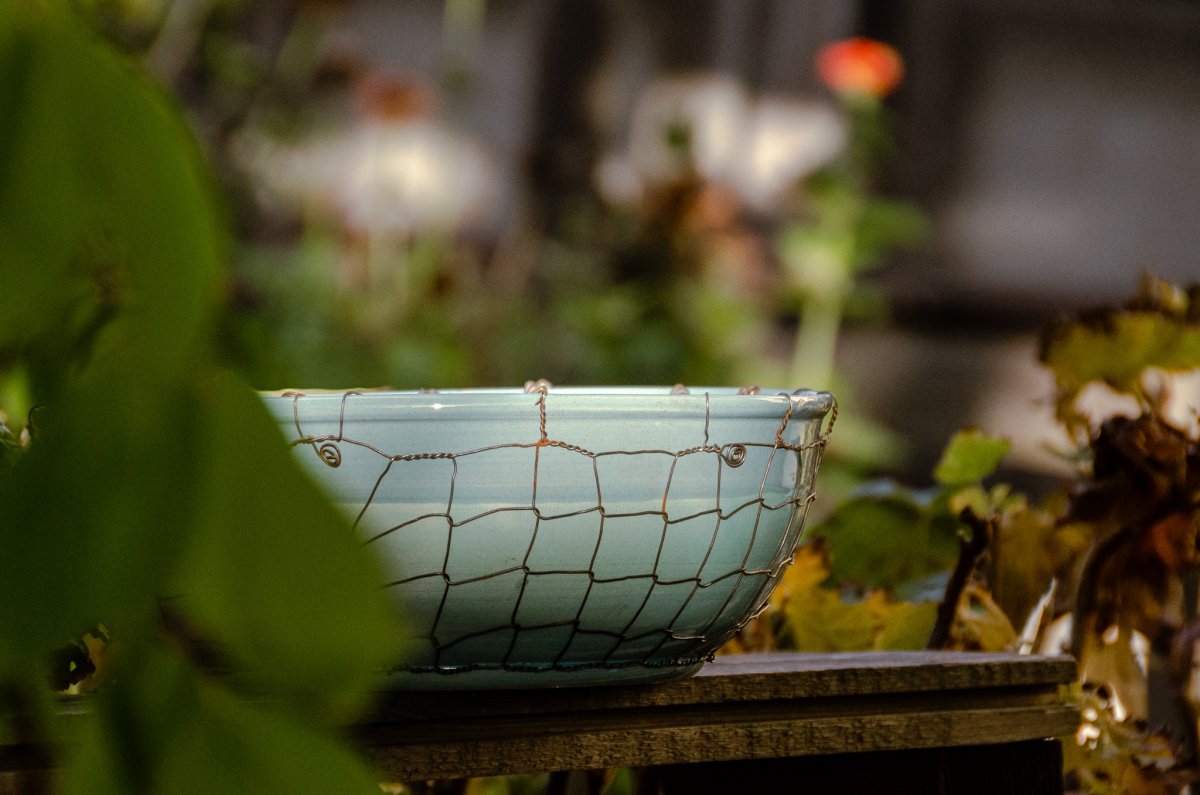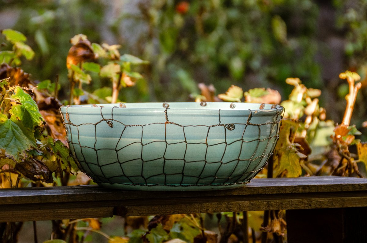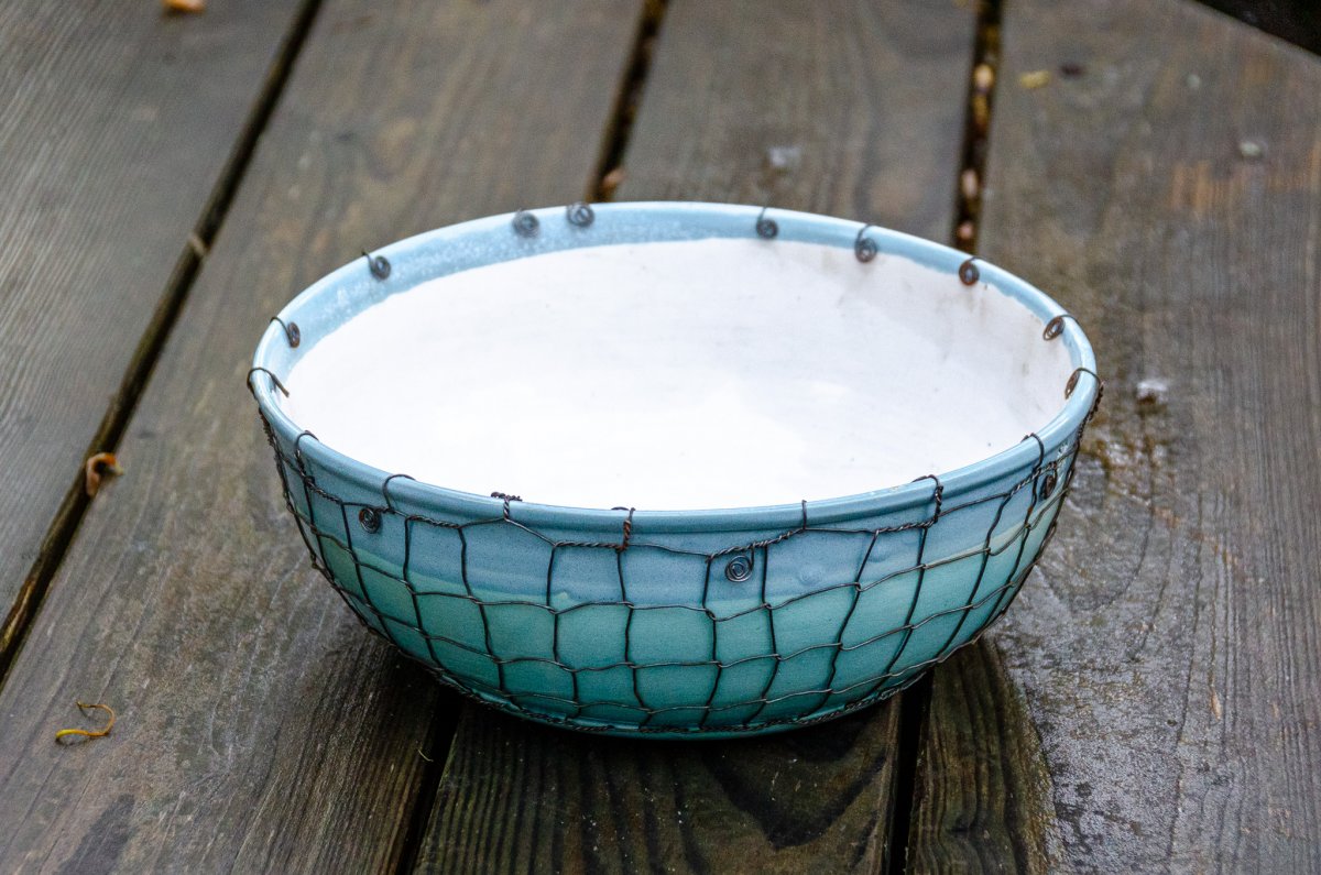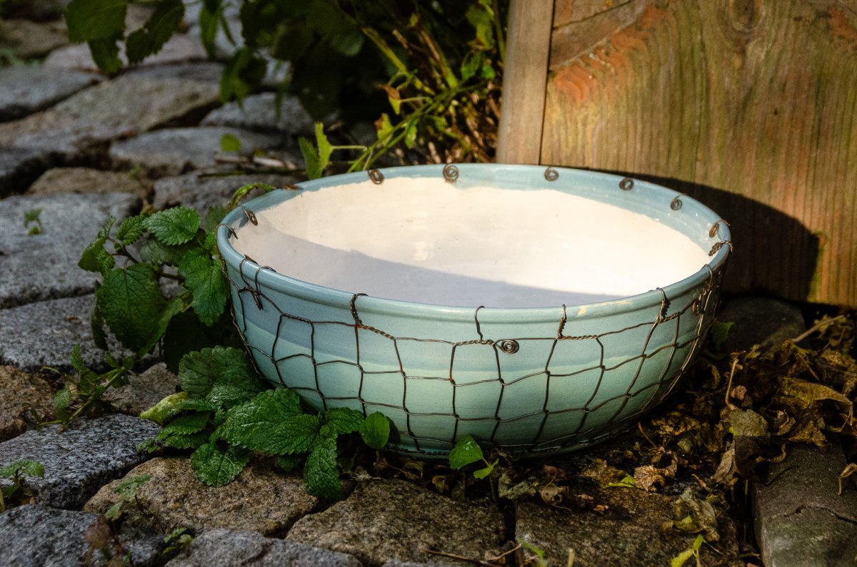 Keramická mísa točená na hrnčířském kruhu a následně odrátovaná. Glazovaná z vnější i vnitřní strany, odrátovaná hutním, taženým drátem (není nerezový).