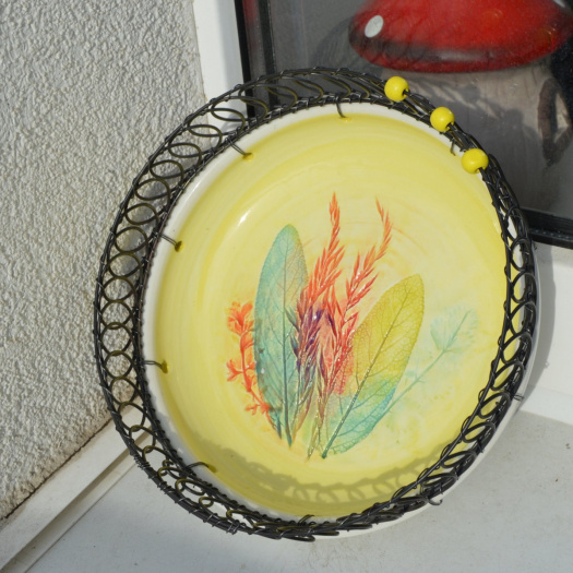 Drátovaná miska s nádherným keramickým dnem odrátovaná černým železným drátem.