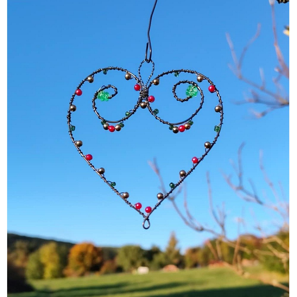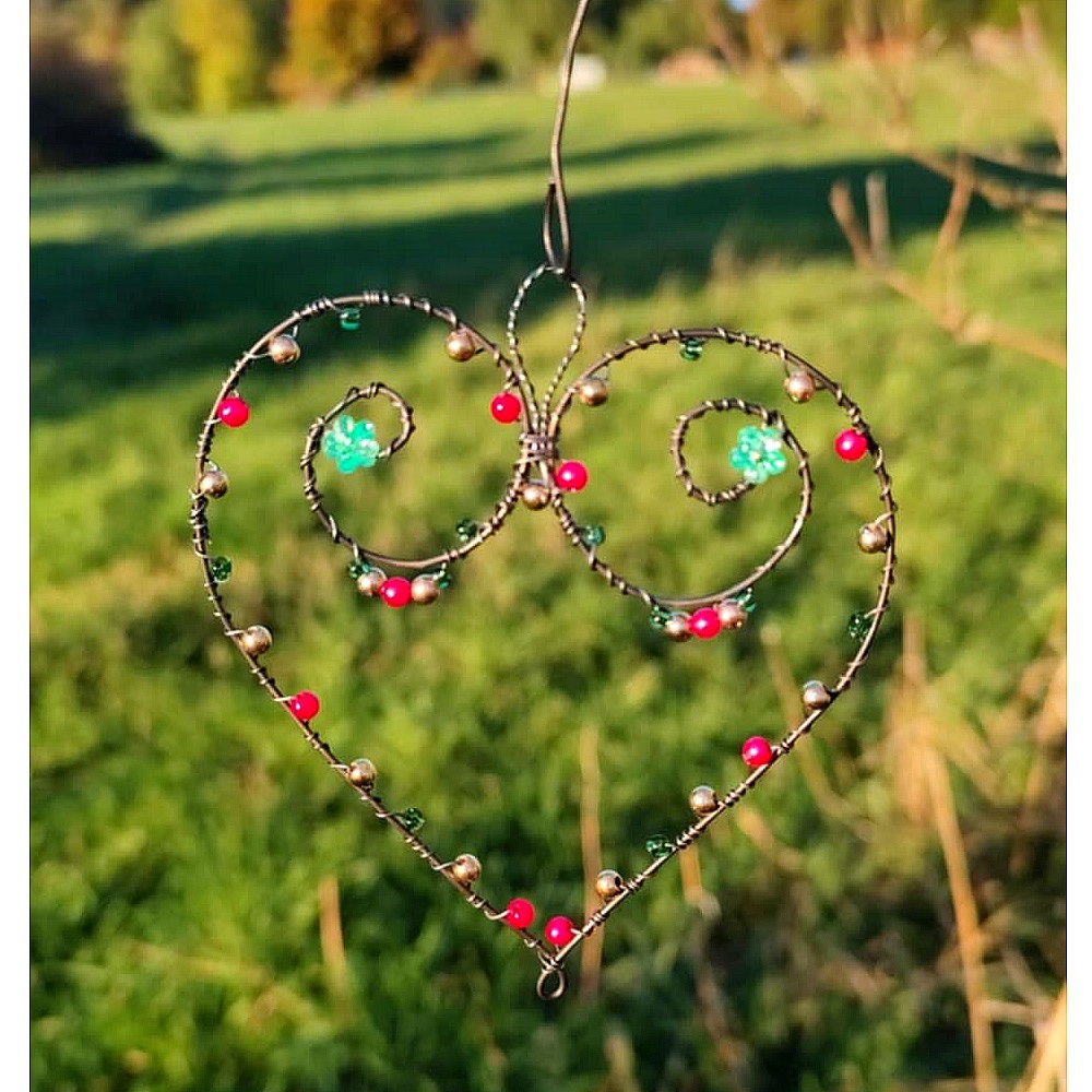 Drátované srdce s barevnými korálky, je vyrobené technikou drátování.