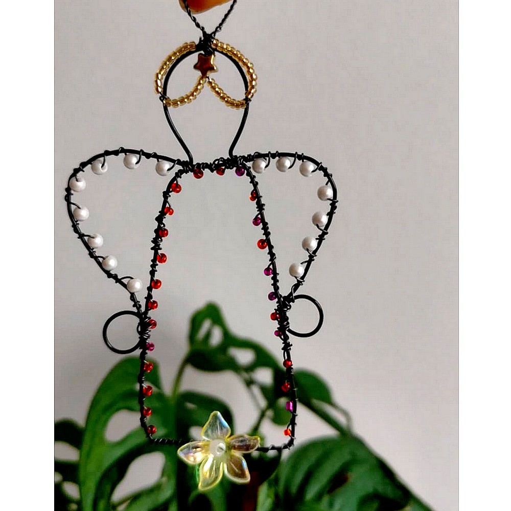 Anděl s barevnými korálky, je vyrobený technikou drátování.
