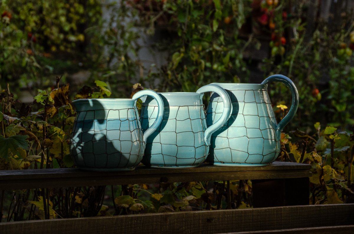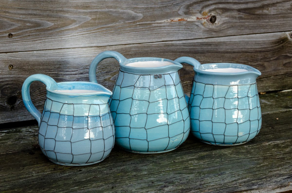 Keramický džbáný točený na kruhu a následně odrátovaný. Glazovaný z vnější i vnitřní strany, odrátovaný hutním, taženým drátem (není nerezový).