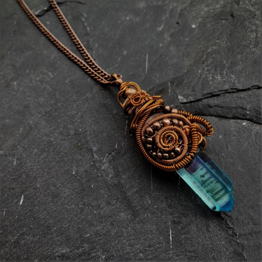 Magický drátovaný přívěsek, amulet, talisman s pokoveným kříšťálem a opalitovým korálkem. Je zhotoven volným stylem technikou wire wrapping.