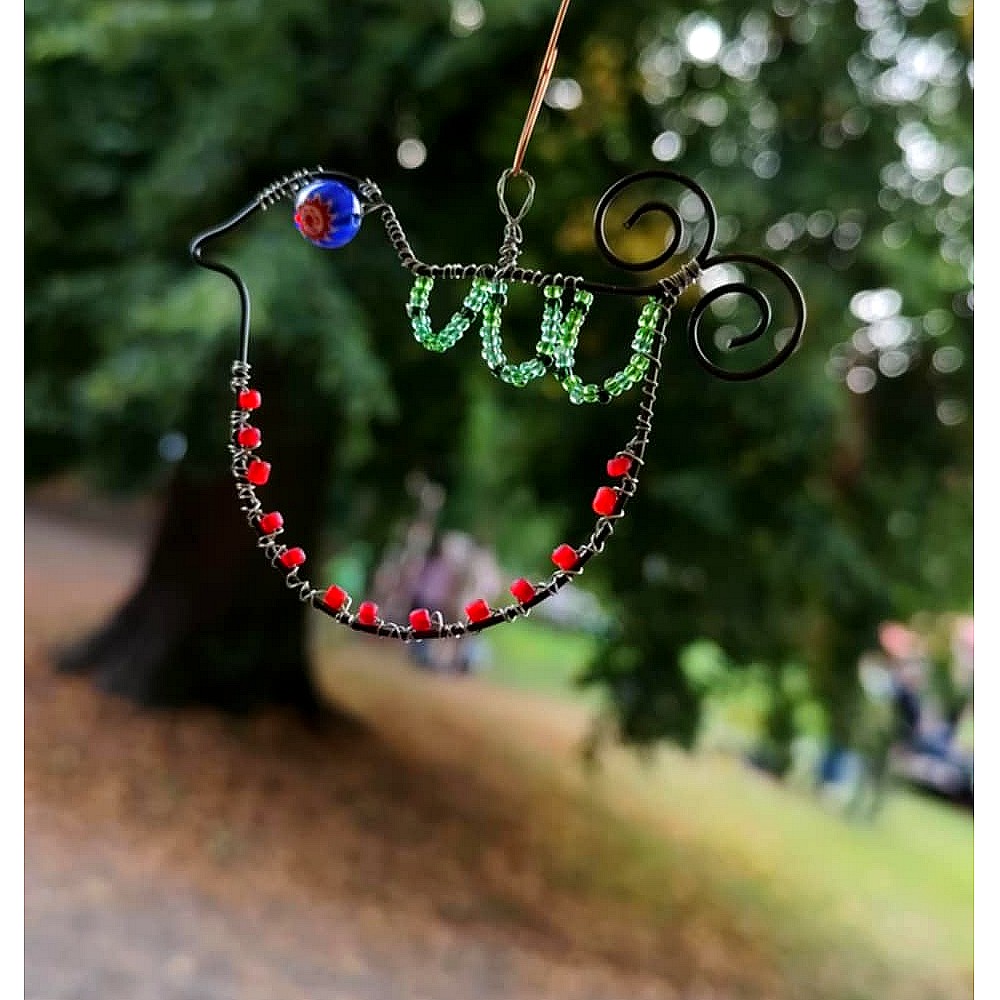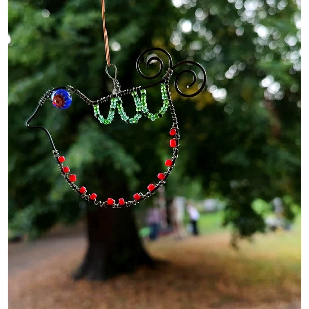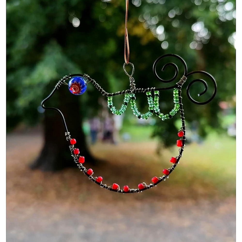 Drátovaný ptáček s barevnými korálky, je vyrobený technikou drátování.