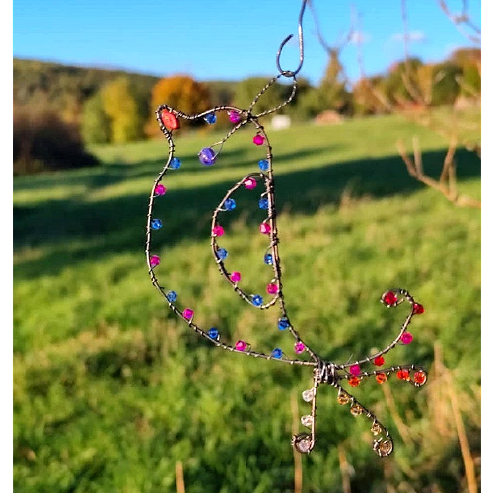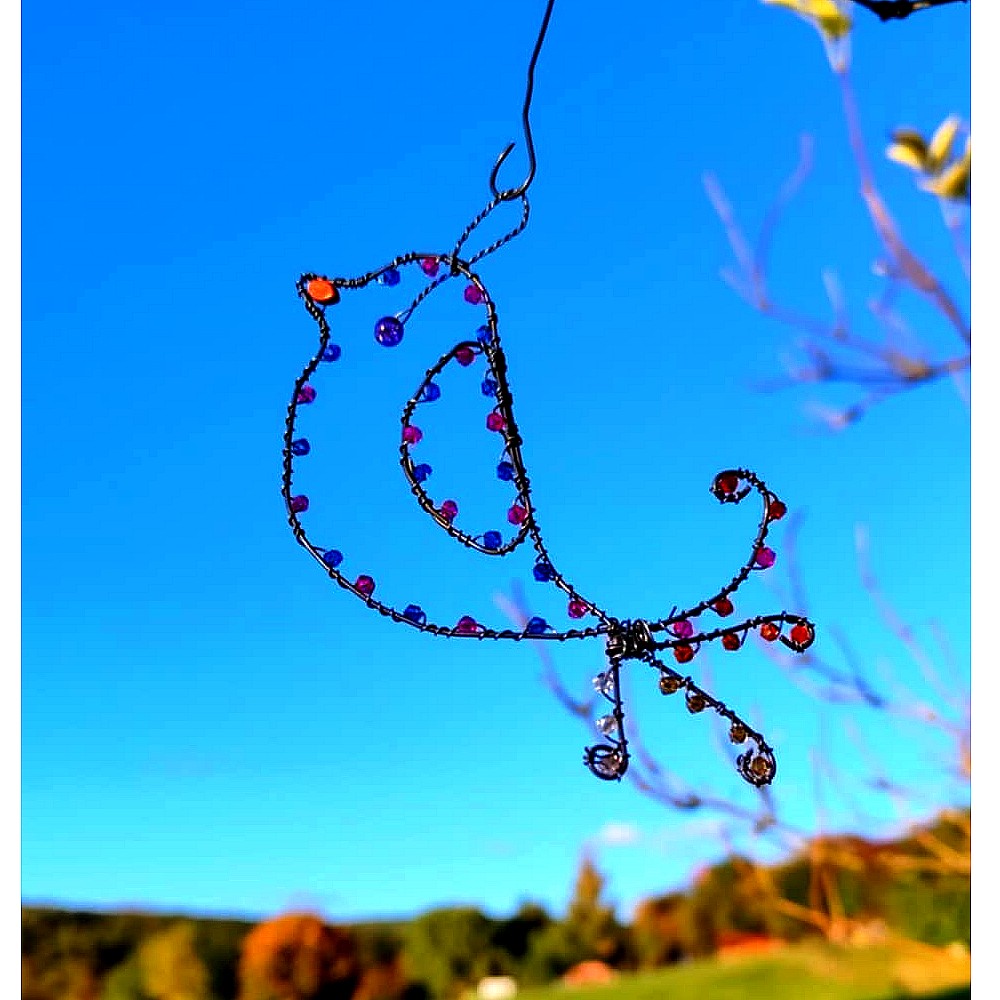 Drátovaný ptáček s barevnými korálky, je vyrobený technikou drátování.