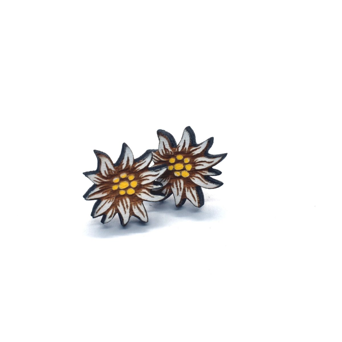 Dřevěné náušnice alpská protěž jsou částečně upraveny akrylovou barvou.