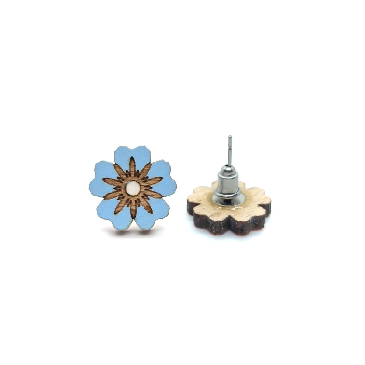 Dřevěné náušnice kytičky modré jsou částečně upraveny akrylovou barvou.