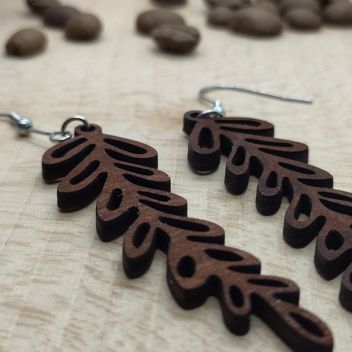 Chcete být originální? Milujete dřevo? Pořiďte si naše dřevěné náušnice ve tvaru lístku v originální grafice.