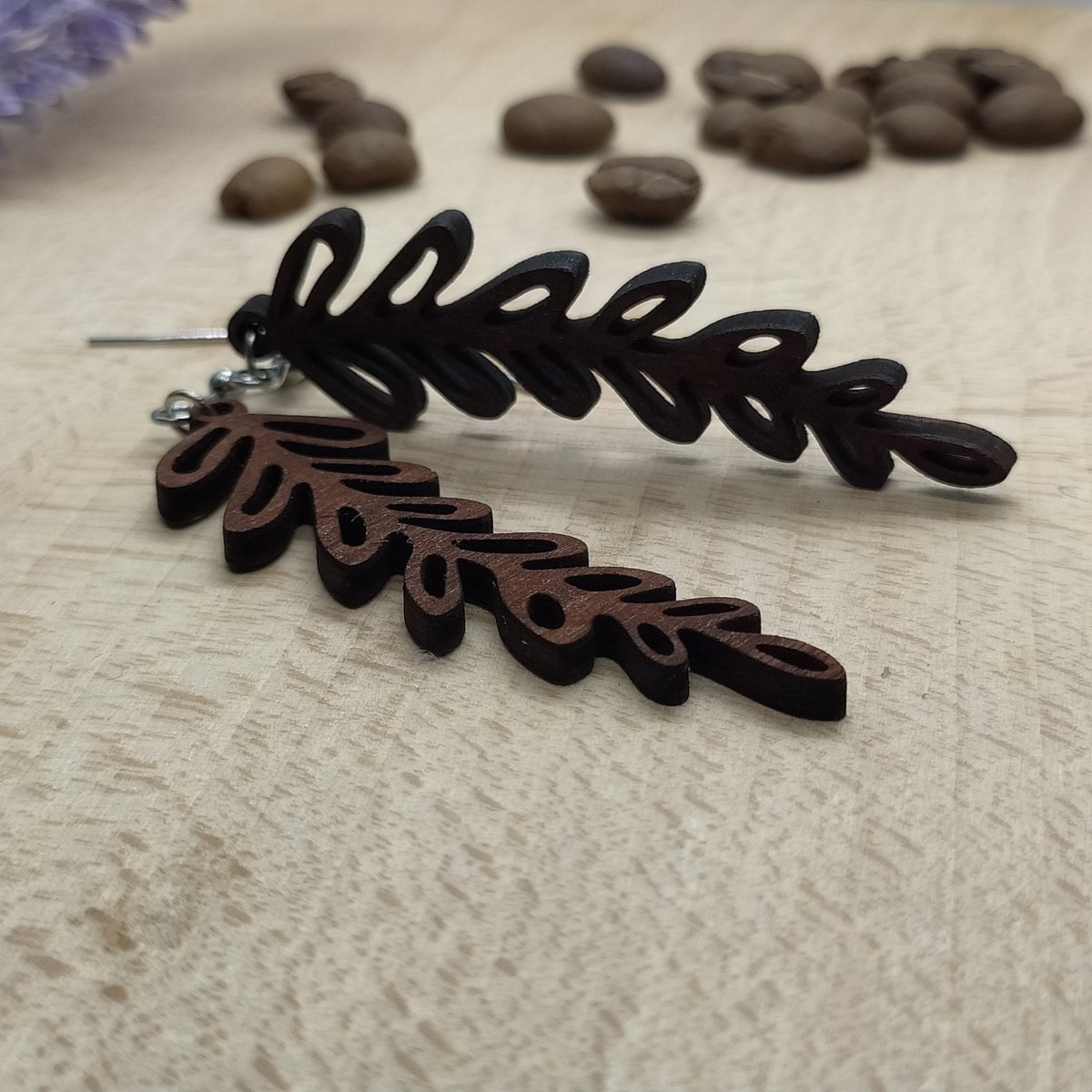 Dřevěné náušnice ve tvaru lístku jsou napuštěny lazurou s odstínem mahagonu.