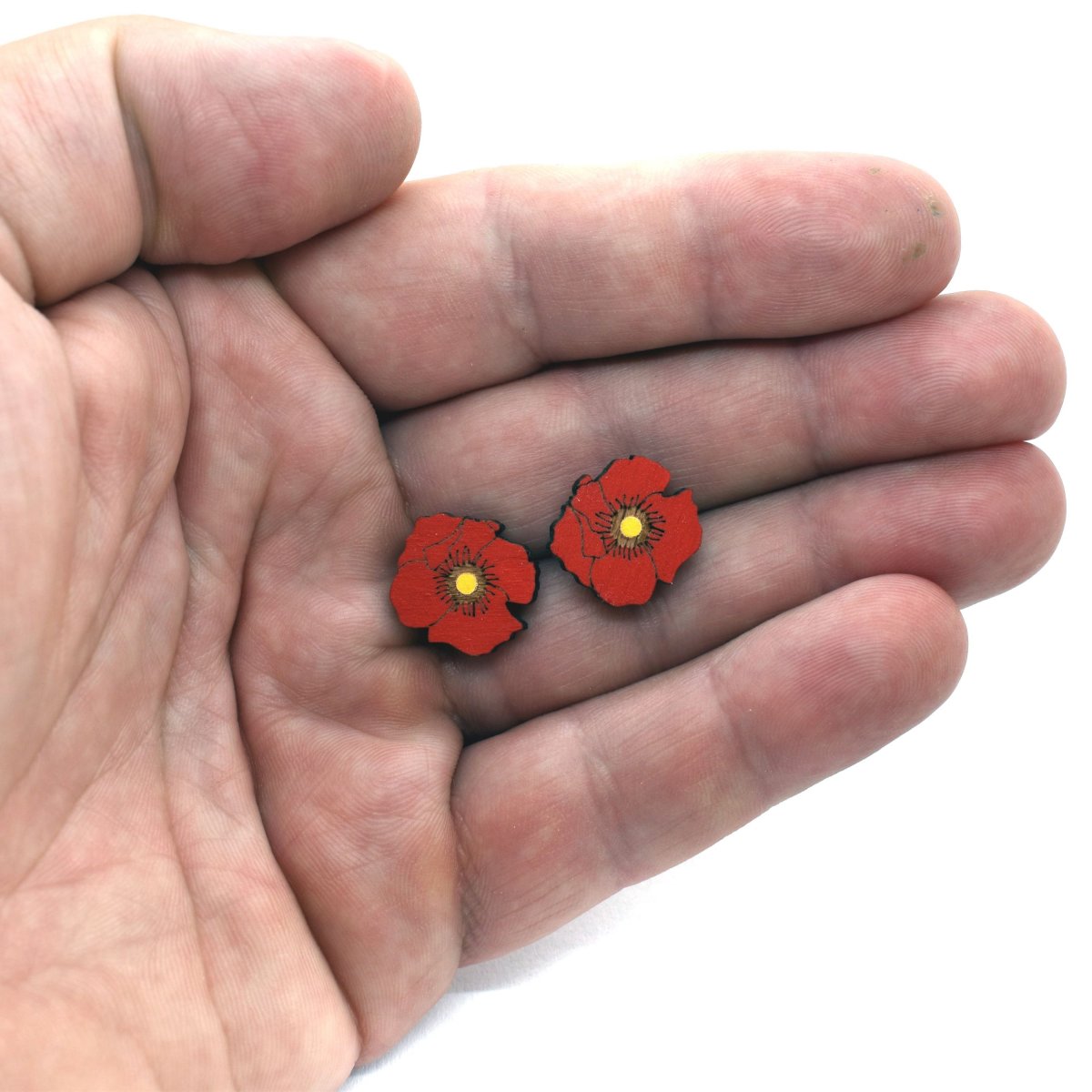 Dřevěné náušnice vlčí máky jsou částečně upraveny akrylovou barvou.