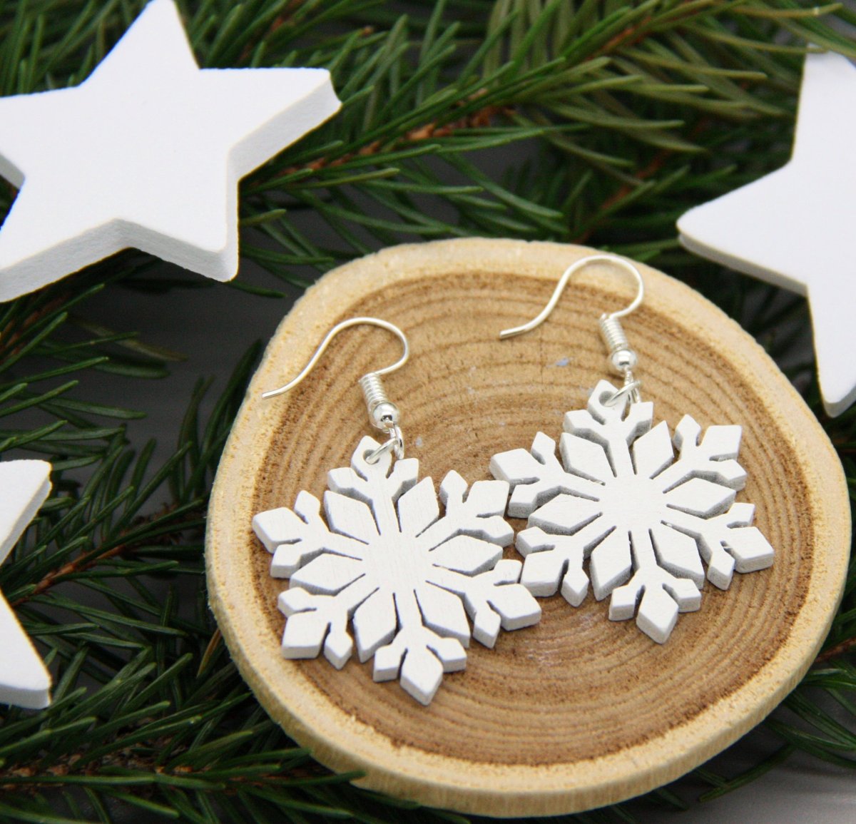 náušnice z dřevěného výseku v podobě sněhových vloček,