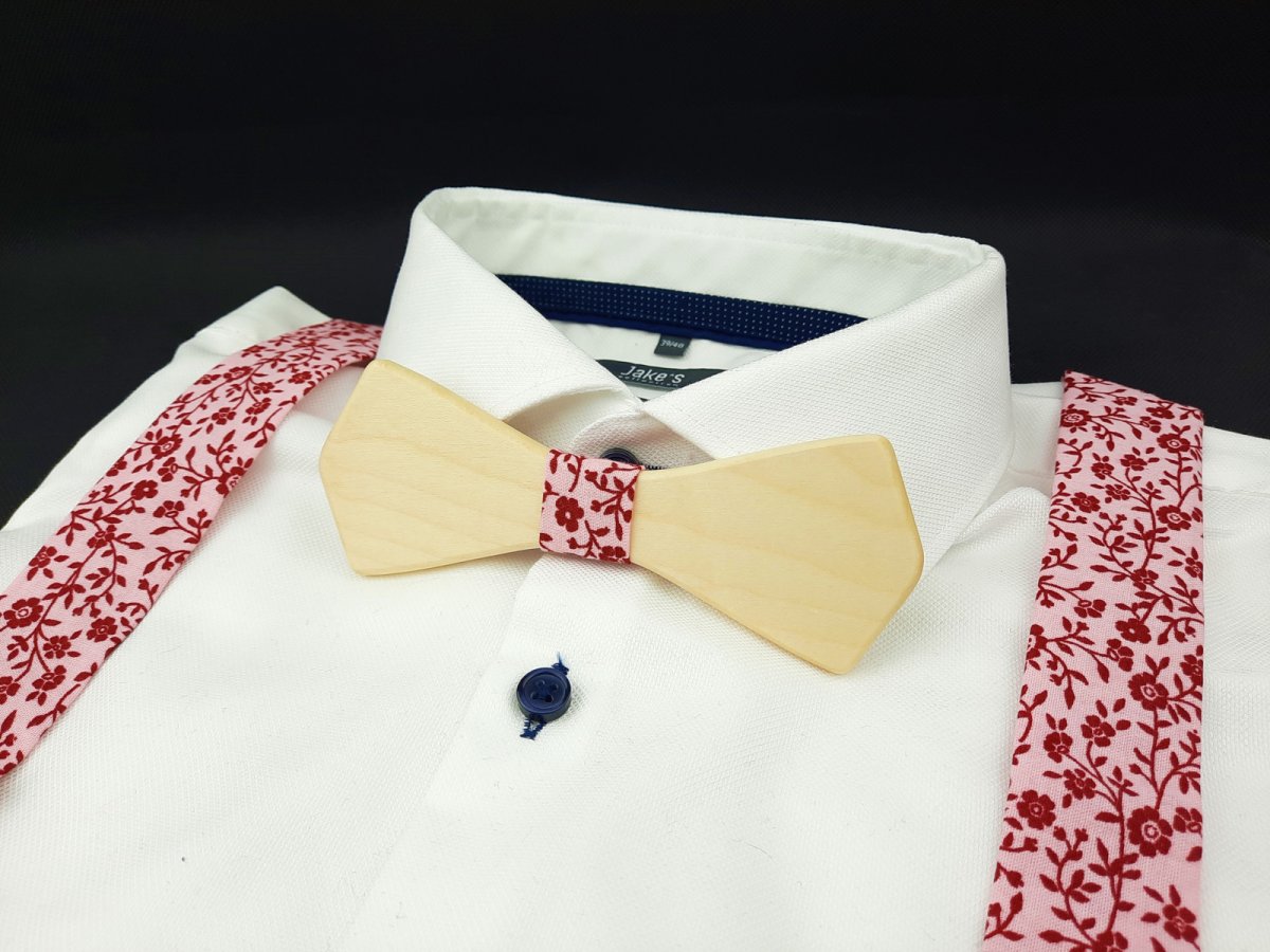 Pánsky set javorový drevený motýlik a traky v elegantnom a jemom ružovom prevedení s kvetovaným motívom, ktorý sa dokonale hodí na akúkoľvek príležoosť. Najlepšie vynikne v kontraste s bielou košeľou. Ak sa chystáte na svadbu, tento set Vám zaručí dokonalý vzhľad.