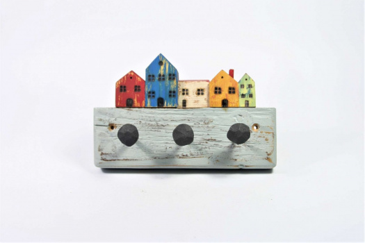 Dřevěný věšák na klíče je vyroben ze starého, recyklovaného dřeva. Malé dřevěné domečky jsou mořené lihovým mořidlem a následně malované akrylovými barvami do kterých se mořidlo částečně vpilo a vytvořilo specifické barevné tóny.