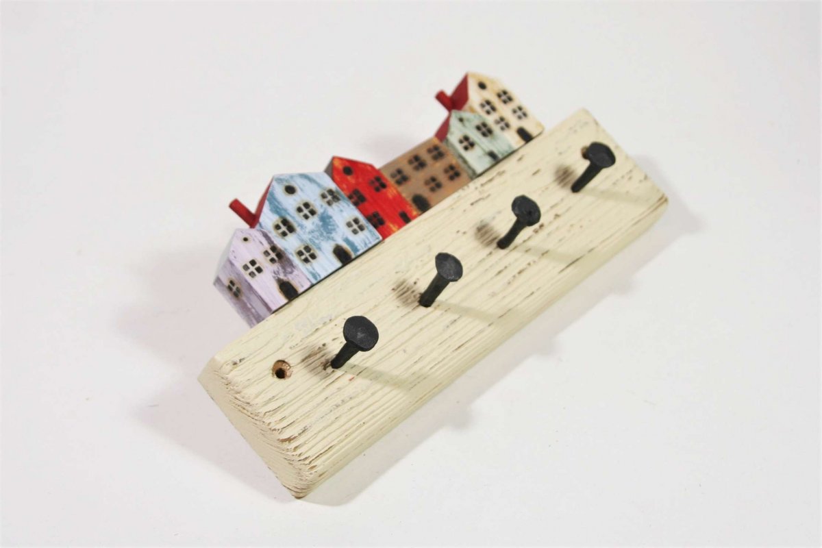 Dřevěný věšák na klíče je vyroben ze starého, recyklovaného dřeva. Malé dřevěné domečky jsou mořené lihovým mořidlem a následně malované akrylovými barvami do kterých se mořidlo částečně vpilo a vytvořilo specifické barevné tóny.