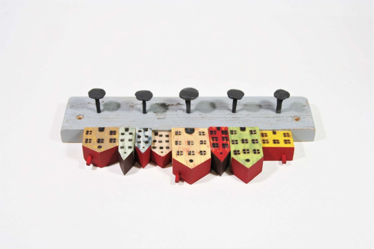 Dřevěný věšák na klíče je vyroben ze starého, recyklovaného dřeva. Malé dřevěné domečky jsou mořené lihovým mořidlem a následně malované akrylovými barvami do kterých se mořidlo částečně vpilo a vytvořilo specifické barevné tóny.