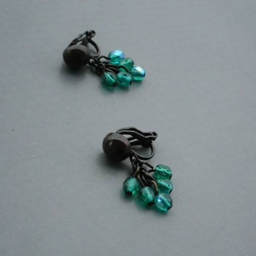 Náušnice tvoří jemný hrozínek, uspořádaný ze zelených broušených skleněných korálků s barevným odleskem.