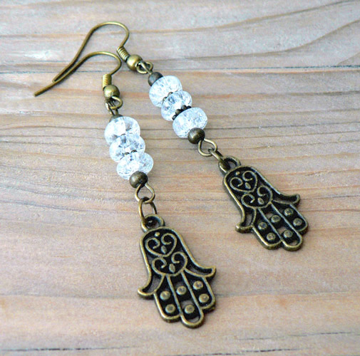 Ochranný symbol ruky fatimy umocňují rondelky z křišťálu, prokládané kovovými mezidíly a zakončené kuličkami