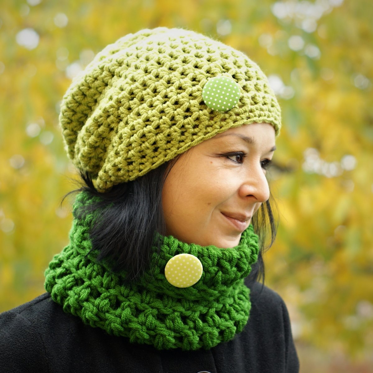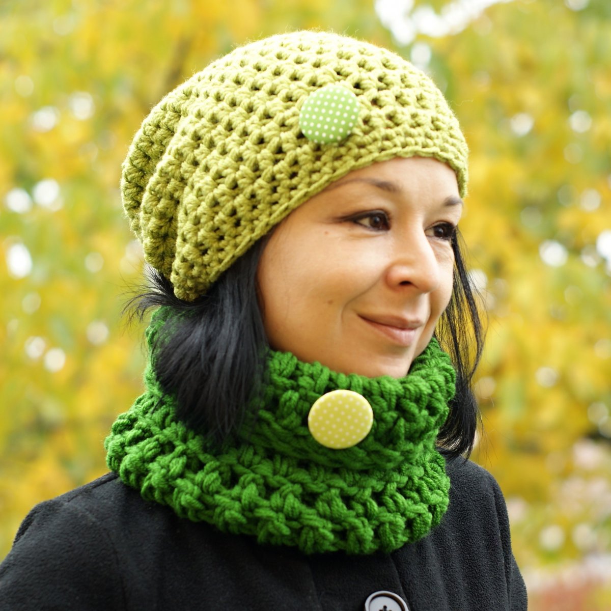 Set je háčkovaný dvojmo, z akrylovej priadze, je teplý, hrejivý, zimný.