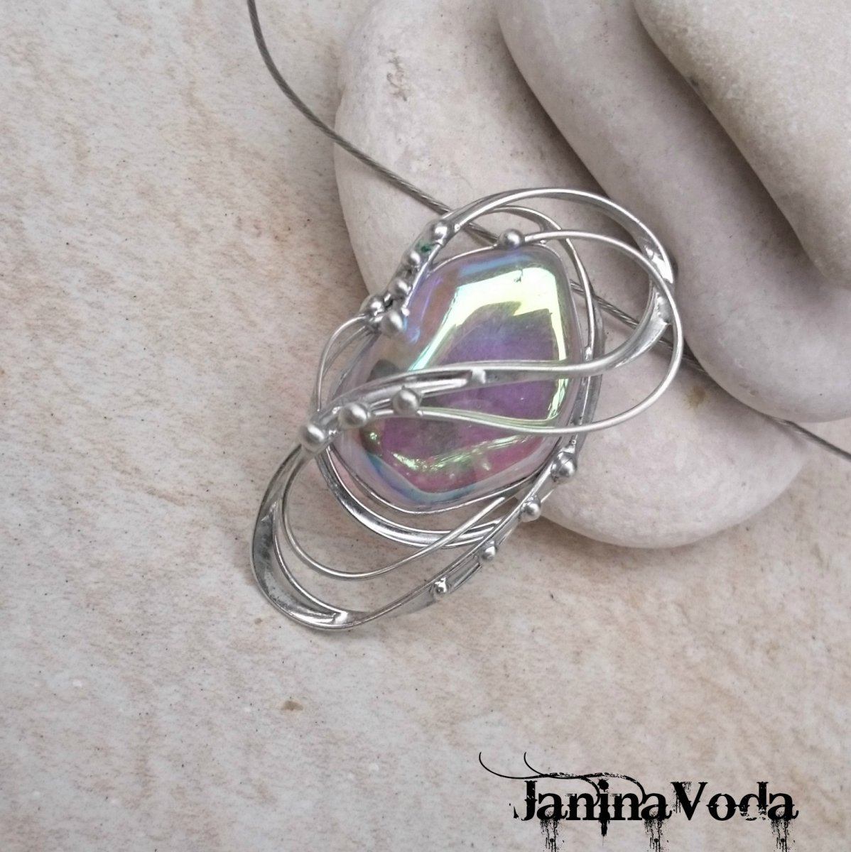 Cínovaný leštěný náhrdelník z tromlovaného kamínku Duhová ( andělská ) aura. Kámen hází odlesky všech barev viz galerie. Náhrdelník je leštěný a ošetřený antioxidačním přípravkem. Velikost šperku: výška 5,5cm, šířka cca 3cm,
