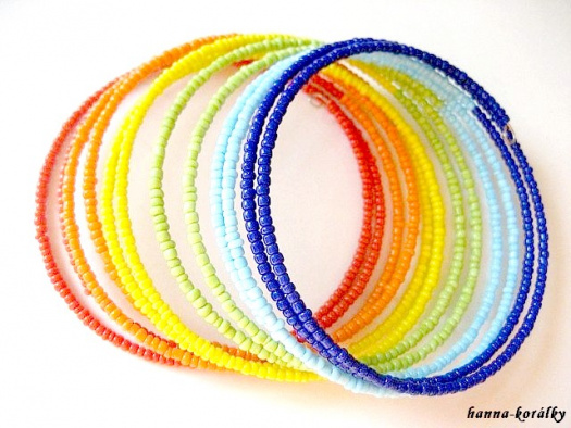 Skleněný rokajl matný v barvách duhy na 12 řadách paměťového drátu.