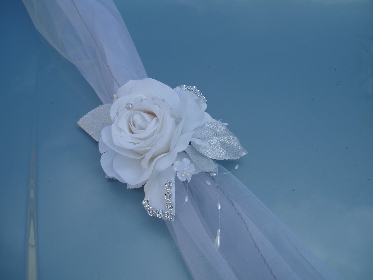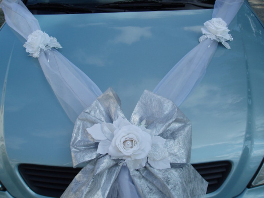 Šerpa na auto v barvách bílé a stříbrné zdobená květy bílé růže a stříbrnou mašlí.